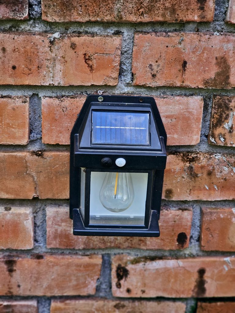 Alternative Text: A small solar-powered wall light is fixed on a red brick wall. The black frame and glass bulb stand out clearly. Taken in Perumanna, Kozhikode, Kerala.