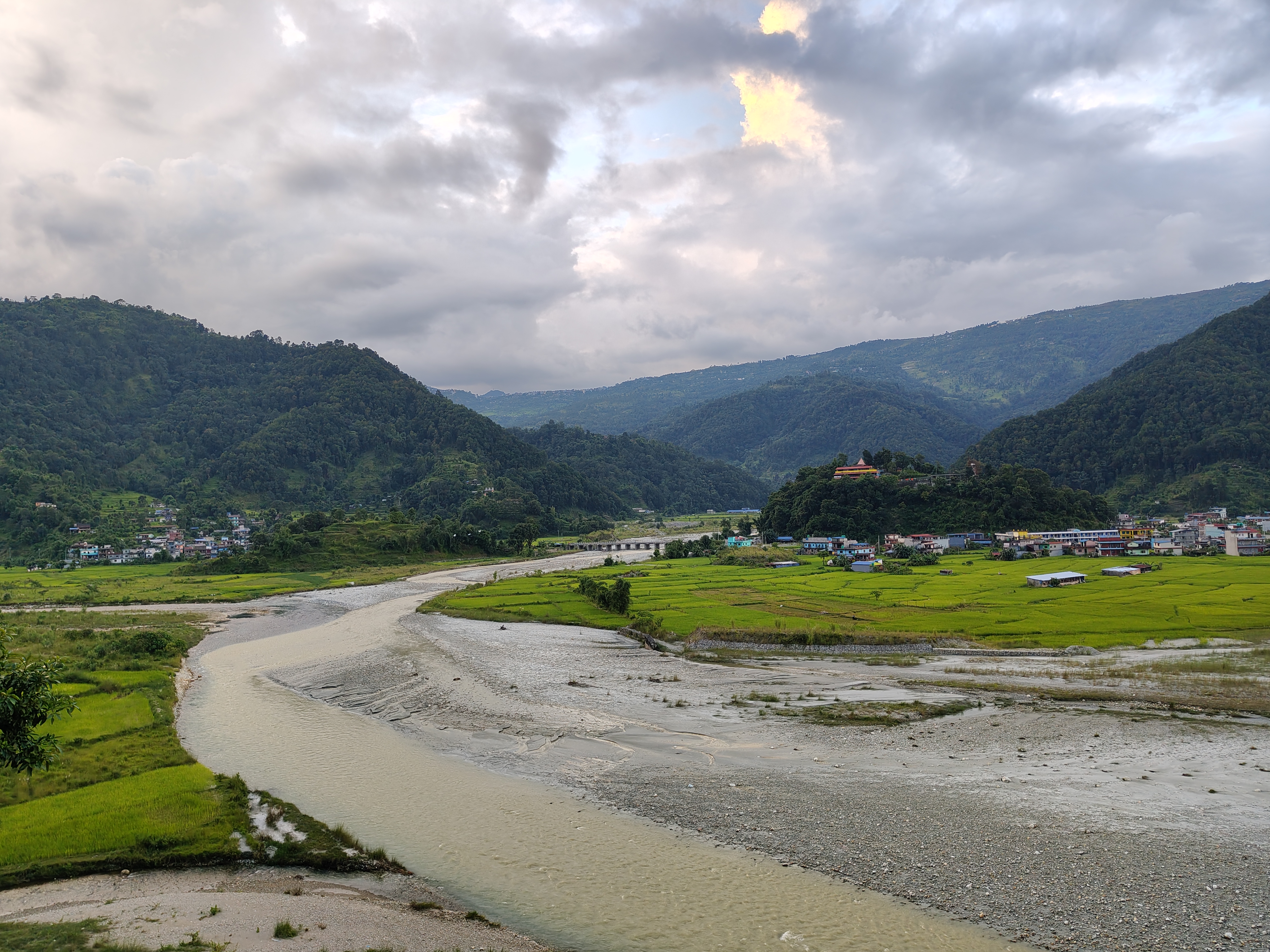Alternative Text: A serene landscape showing a winding river flowing through lush green fields, bordered by hills covered in dense forest.