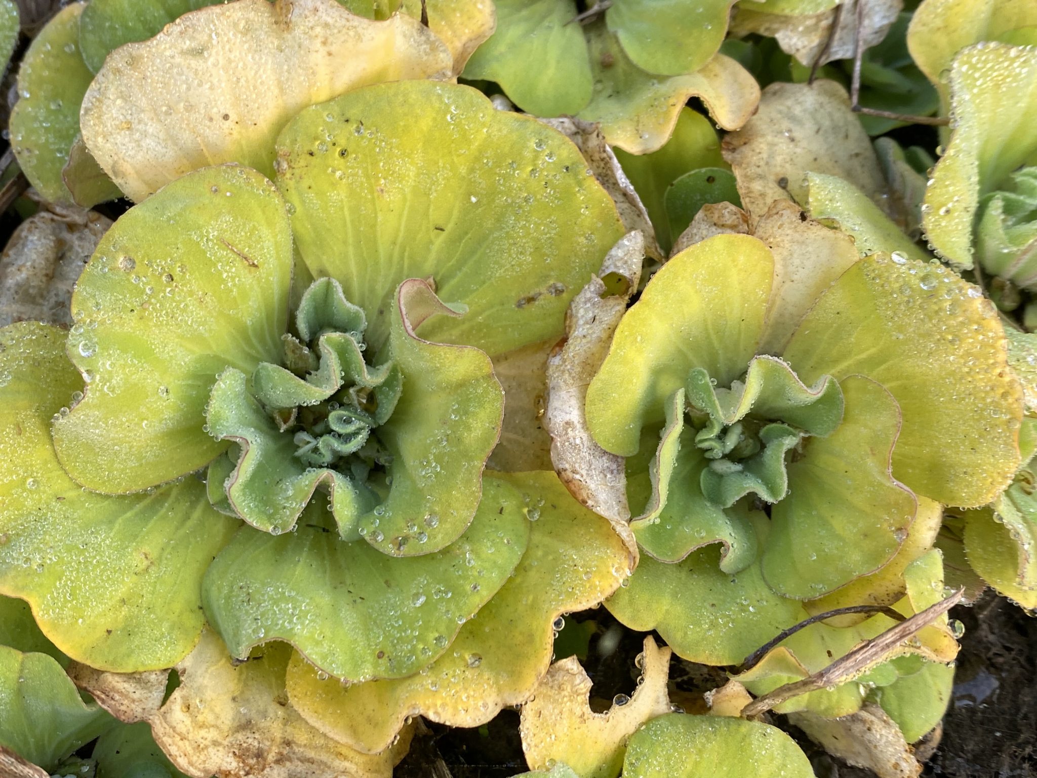 Alternative Text: A close-up of green and yellow wavy-edged leaves layered together, some with fresh water droplets.