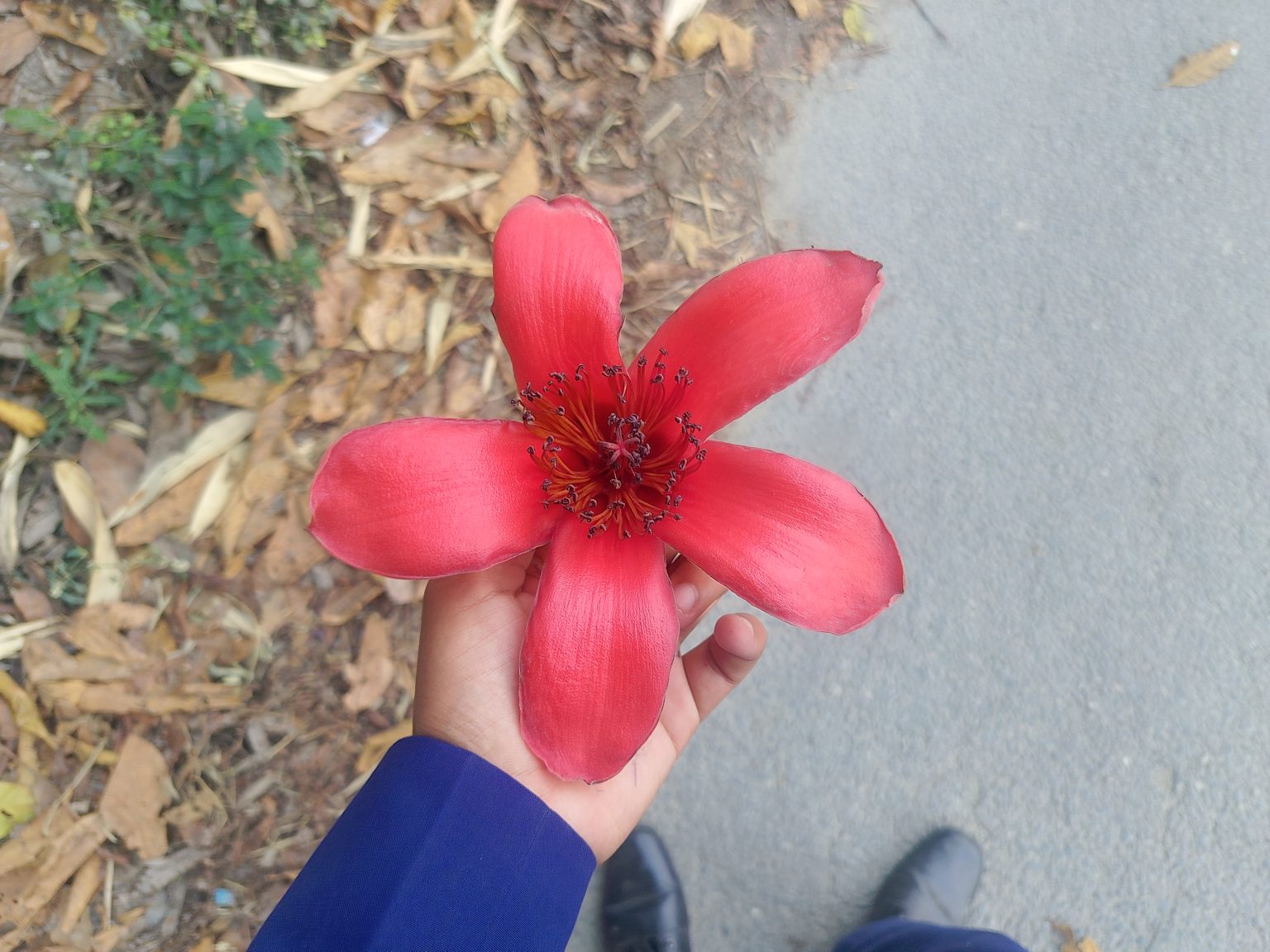Alternative Text: A hand is holding a large, vibrant red flower with five wide petals that are smooth and slightly curled at the tips. The center of the flower features a cluster of dark purple stamens.