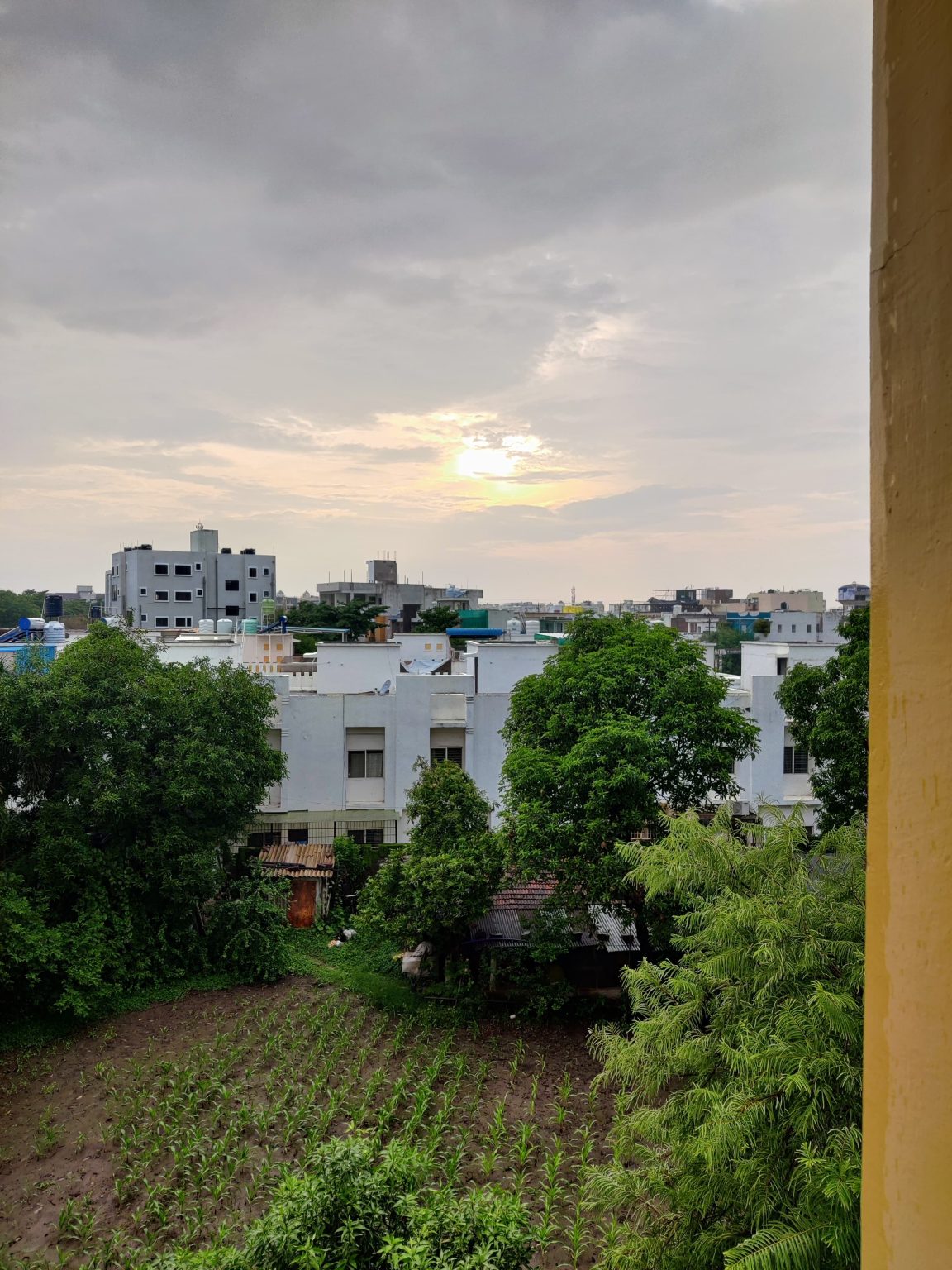 Alternative Text: A photo from a window showcased the beautiful sunset and green lush trees around the apartment complex.