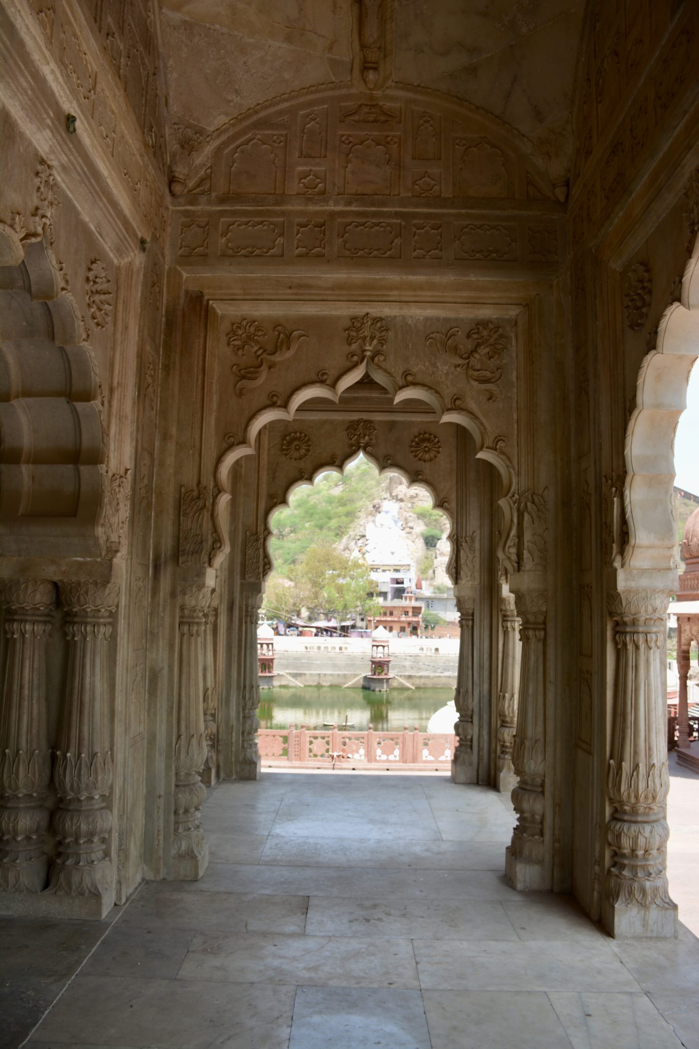 Alternative Text: View through an arched marble doorway at Moosi Maharani Ki Chhatri (Alwar, Rajasthan) framing the pond and pavilions beyond.
