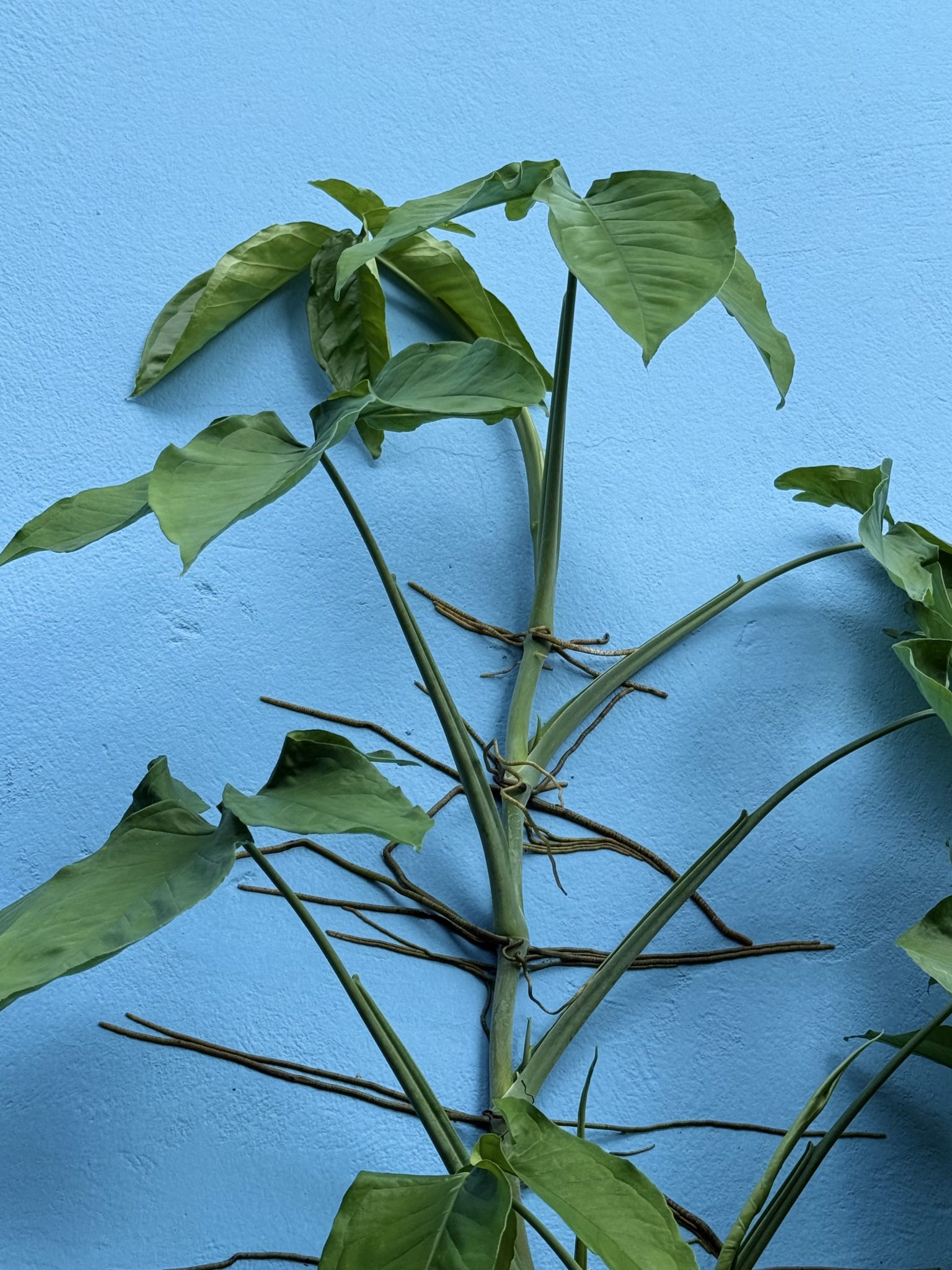 Alternative Text: A green plant with large leaves is growing against a textured blue wall. The plant’s stems and leaves are vividly contrasted against the bright background