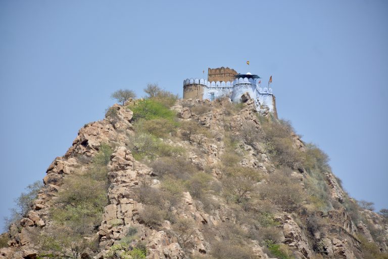 Alternative Text: A hilltop temple fortress with white and blue walls rises dramatically above rocky slopes and sparse vegetation, viewed from Moosi Maharani Ki Chhatri, Alwar, Rajasthan.