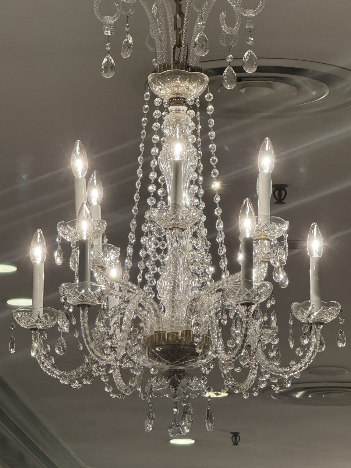 Alternative Text: Crystal chandelier with illuminated candle-style lights.