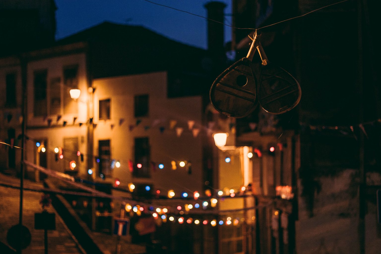Alternative Text: Nighttime street scene in Porto during the summertime festival São João, with colorful string lights and castanets – traditional percusion instruments – hanging across the narrow street. Old buildings are softly lit by warm street lamps, and other traditional festival decorations hang in the foreground, slightly out of focus.