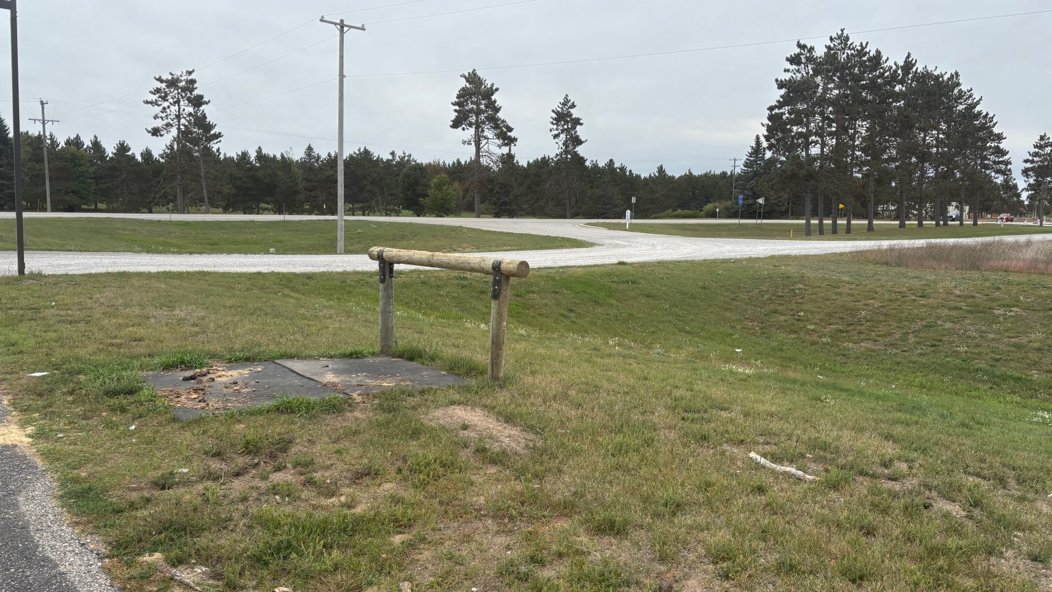 Alternative Text: A modern hitching post for tying up horses next to a road.