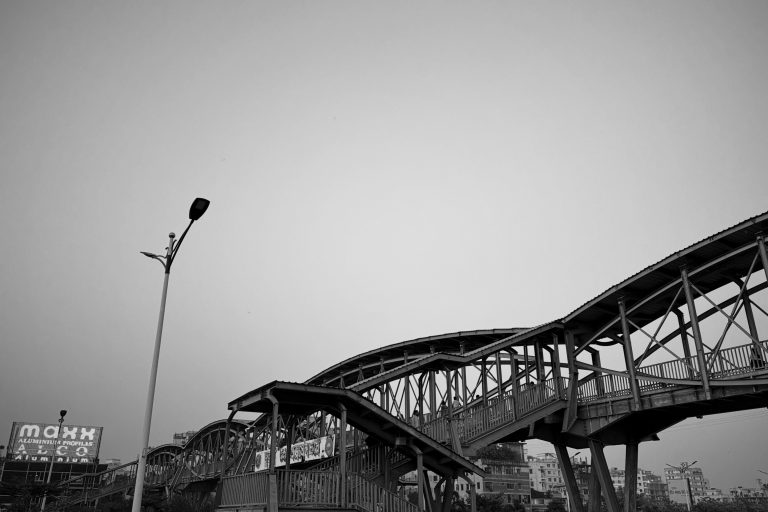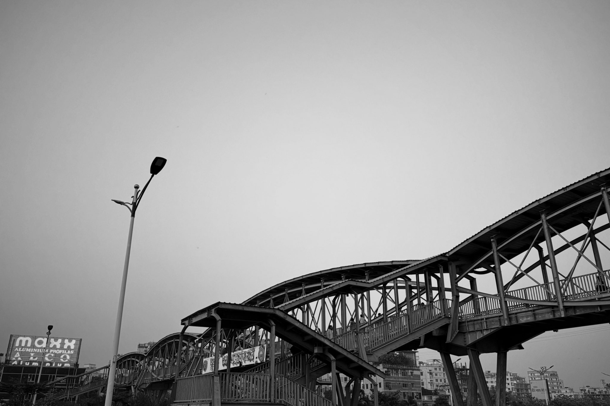 Alternative Text: A gracefully curved wooden pedestrian bridge arches against a clear sky in this black and white urban scene. Below the elevated structure, a street lamp and the edge of a nearby building provide context to the bustling city environment.