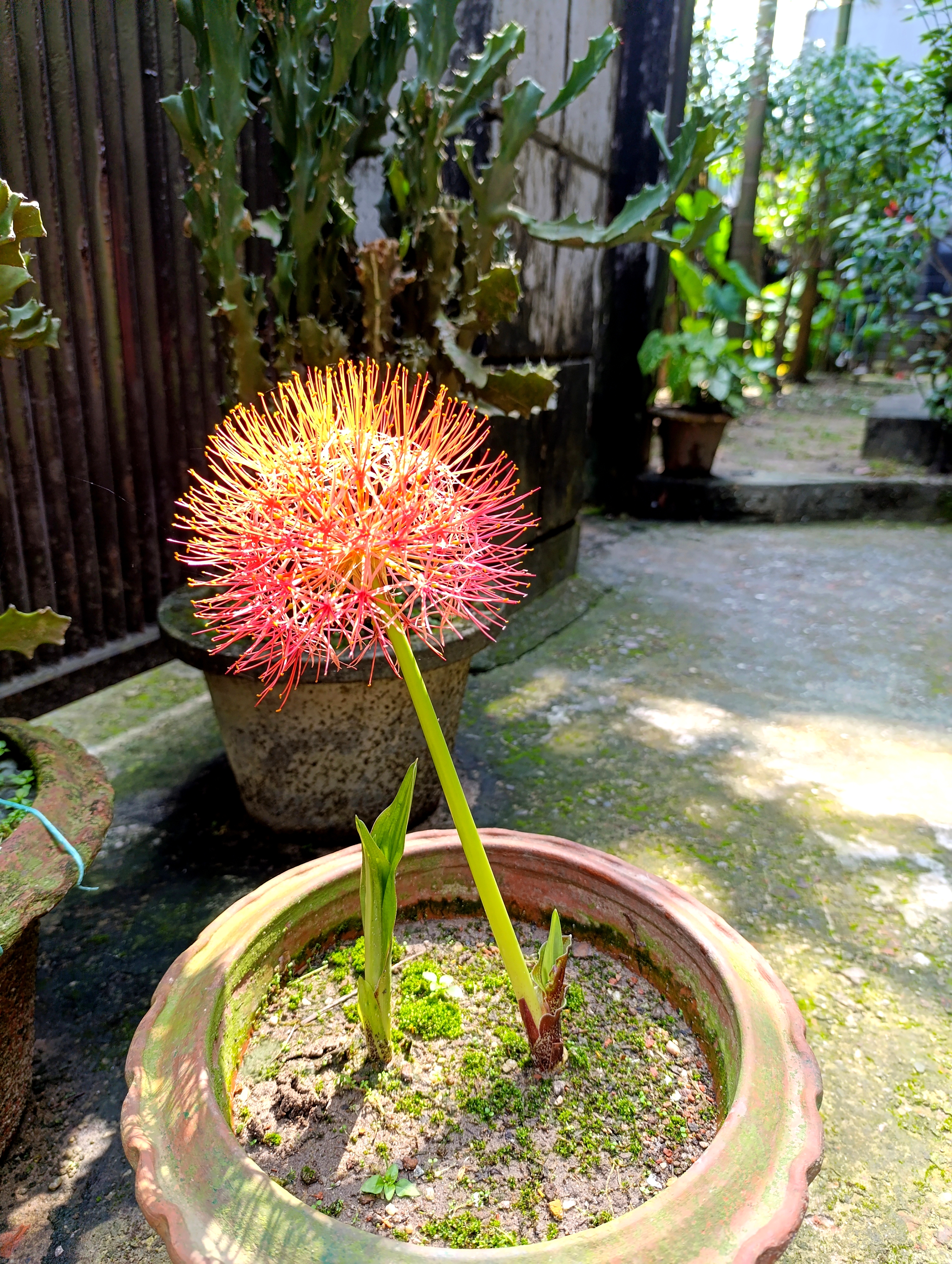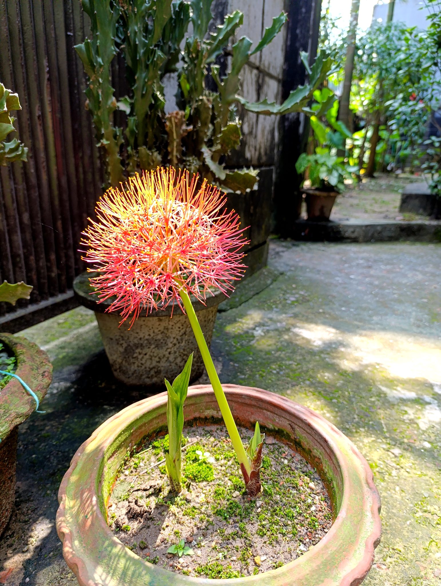 Alternative Text: A vibrant red flower with long, spiky petals stands tall in a terracotta pot, surrounded by small green leaves and moss. In the background, there are various plants, including a tall, textured cactus and lush greenery from a garden setting.