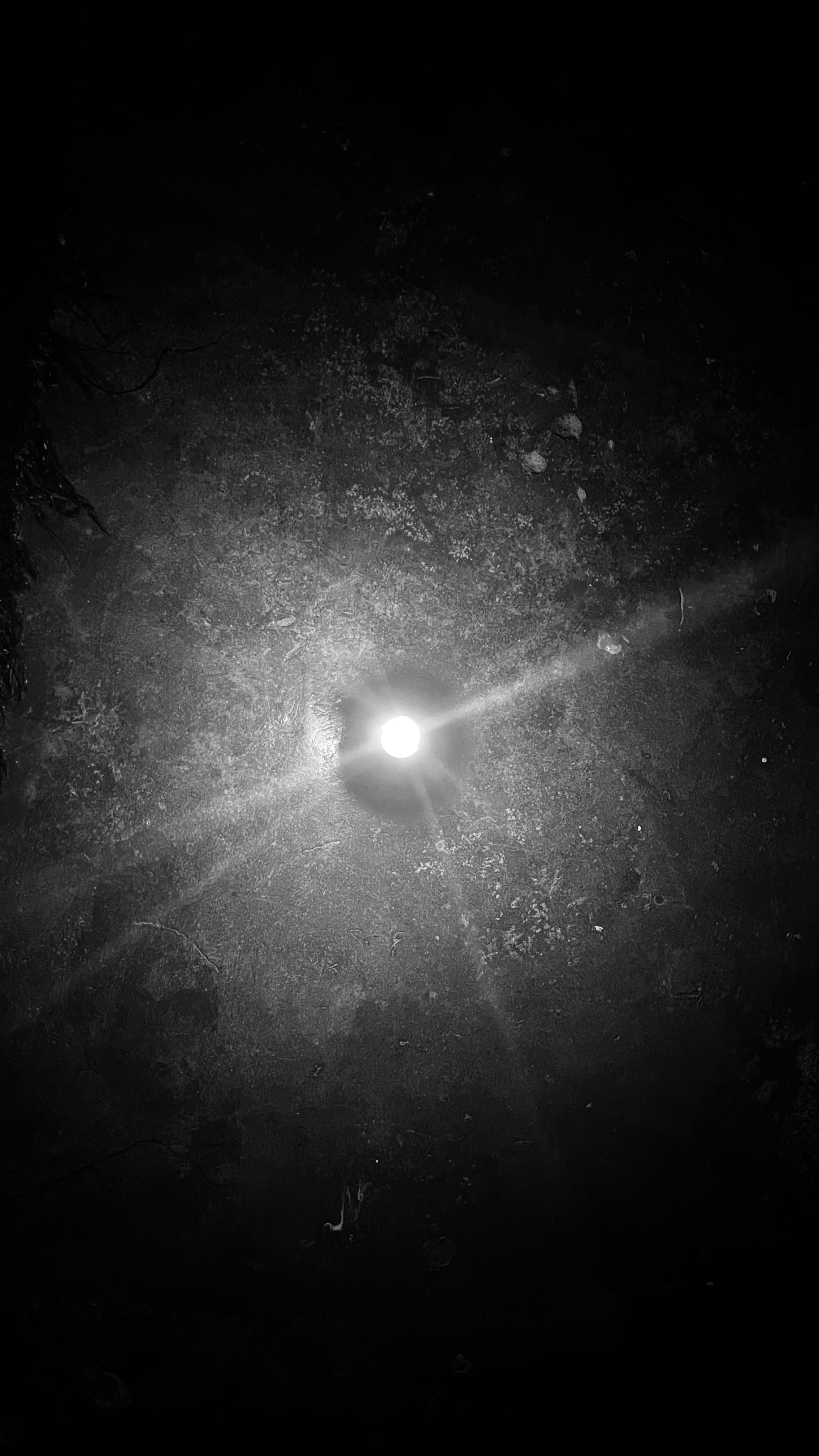 Alternative Text: An image of a candle light taken from above illuminating a central circular spot surrounded by flared light showing a textured floor in a dark room.