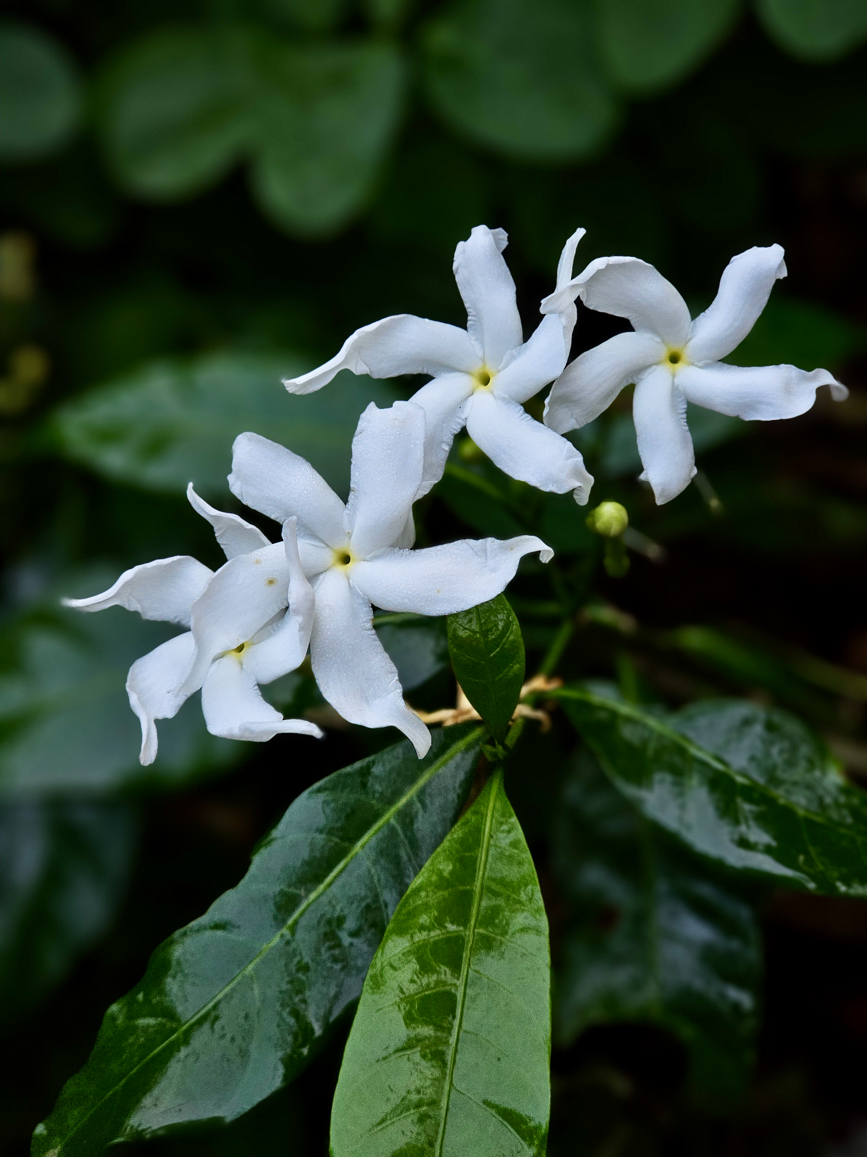 Alternative Text: Delicate white pinwheel jasmine flowers with dewy petals glow gently against dark green leaves in Kozhikode, Kerala, capturing the purity and fragrance of this beloved garden plant.