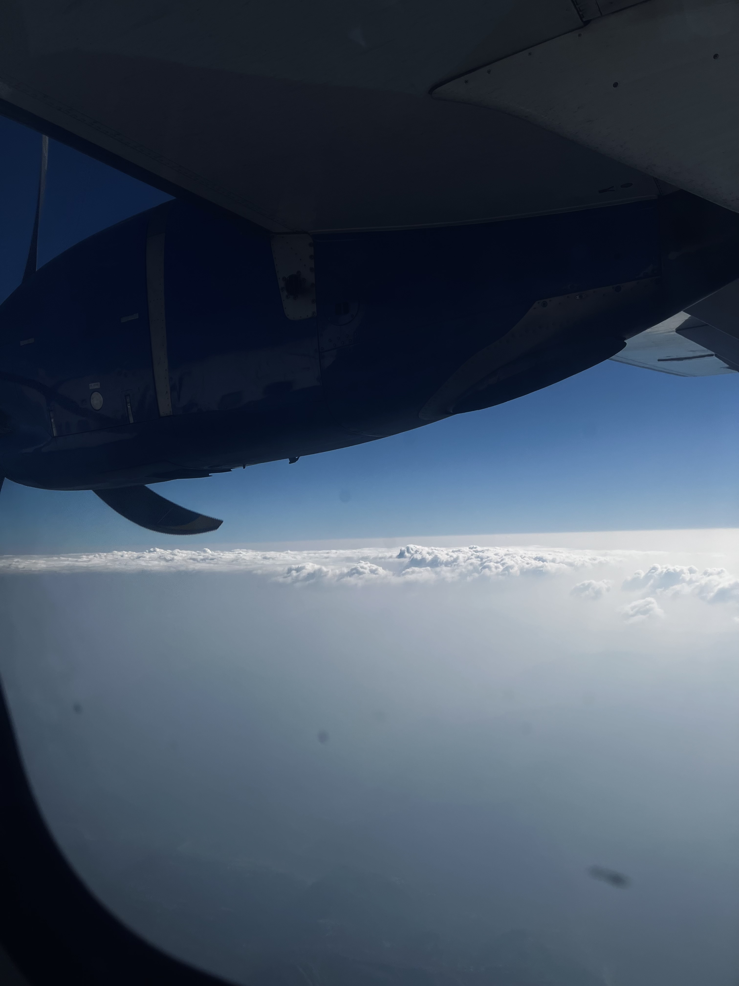 Alternative Text: A view from an airplane window showing a blue and white airplane wing and propeller against a backdrop of fluffy white clouds and a clear blue sky.