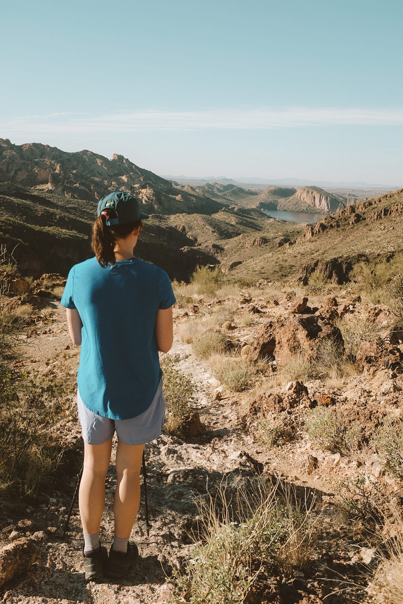 Alternative Text: Person hiking pausing to look out over the rocky desert landscape in the distance, including a body of water.