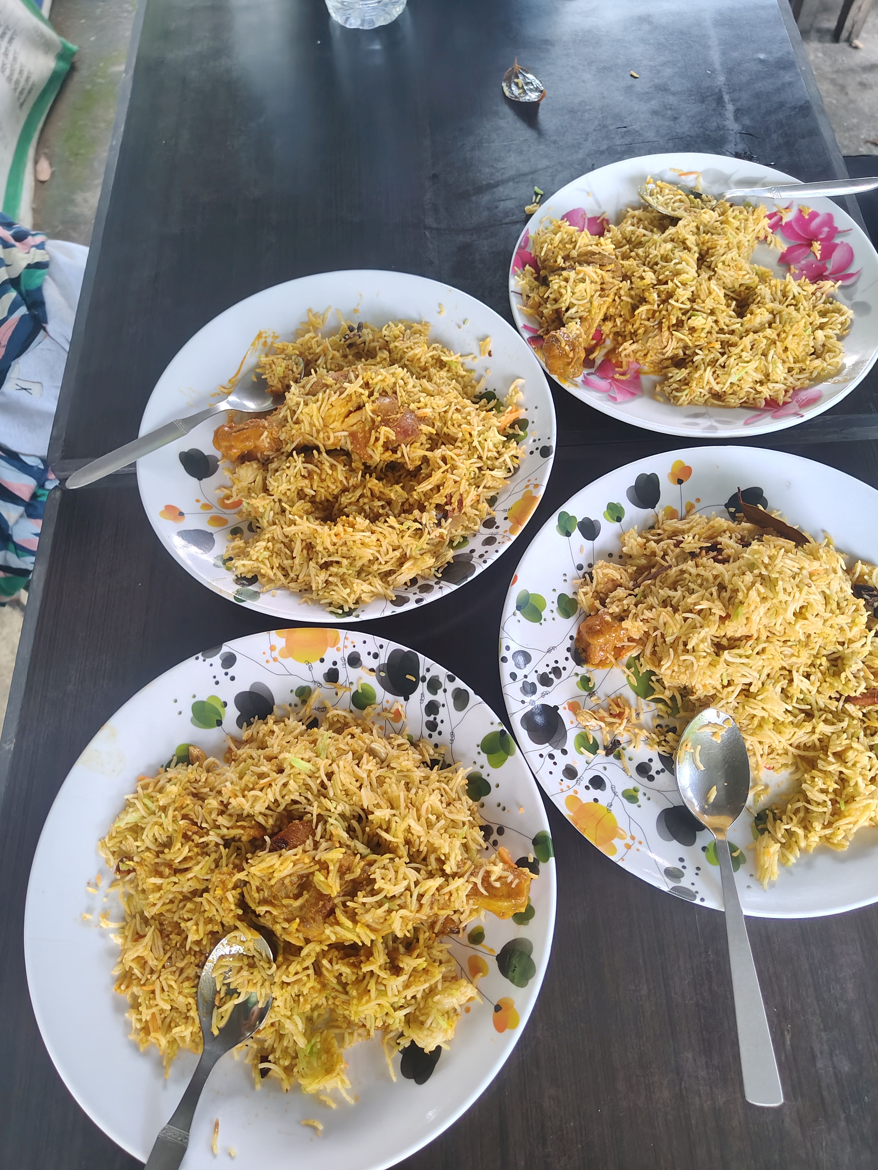 Alternative Text: A table set with four plates of biryani, a traditional rice dish, each with a generous serving