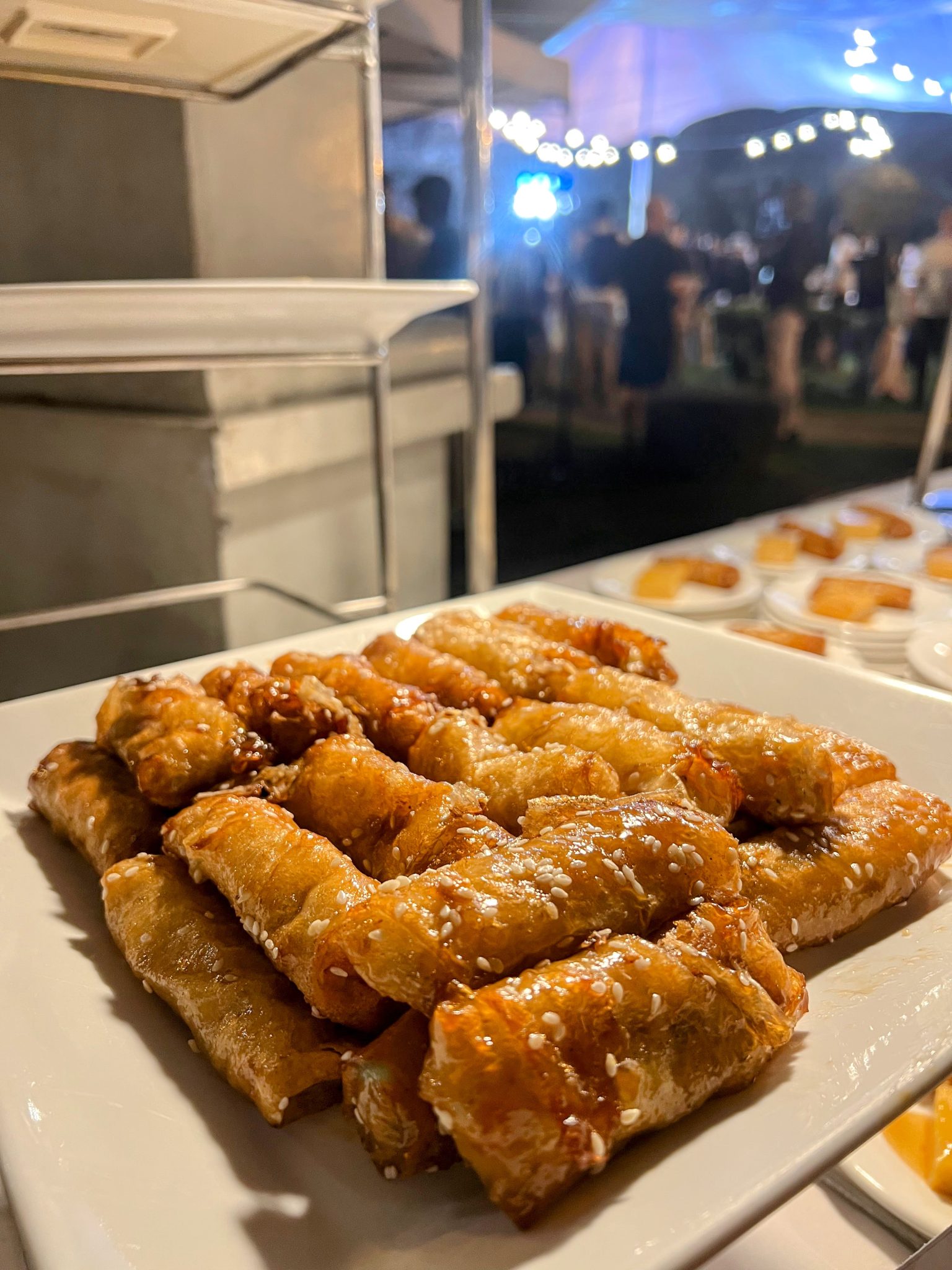 Alternative Text: A platter of glazed, golden-brown spring rolls topped with sesame seeds is on a buffet table, with blurred figures and lights from an evening event visible in the background.