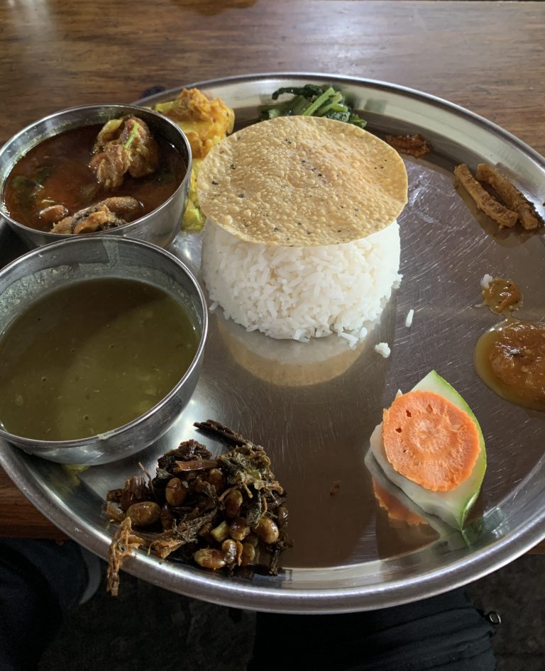 Alternative Text: A traditional Nepali khana set served on a steel plate with rice, curry, lentils, vegetables, pickles, and sides.