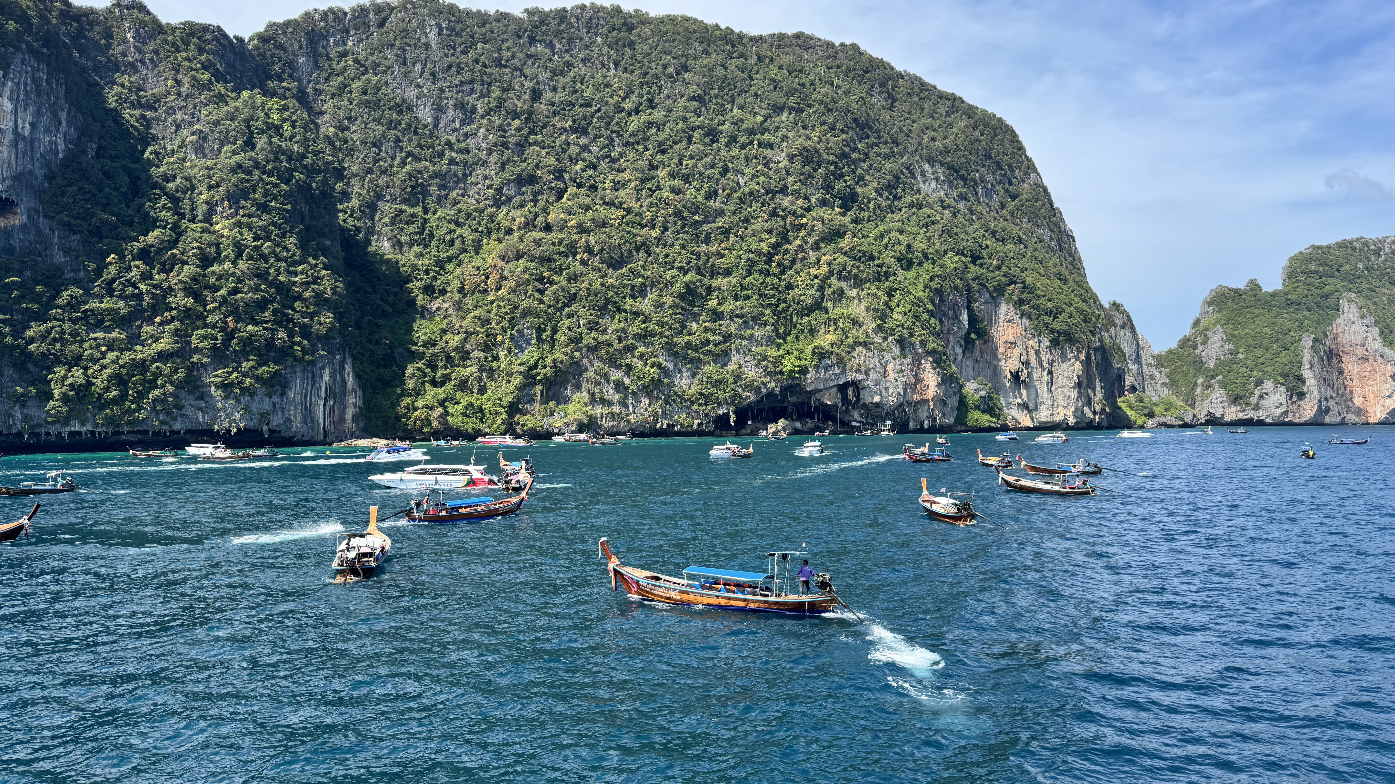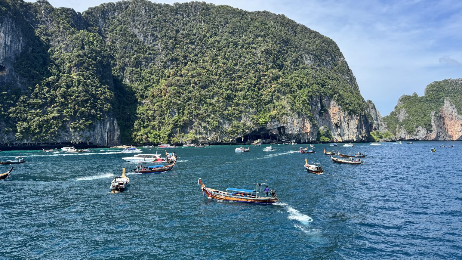 Alternative Text: Tourists on the deck of a boat looking out at a stunning panoramic view of massive limestone islands and turquoise water under a bright blue sky.