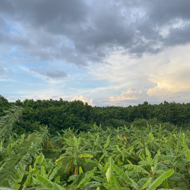 Alternative Text: A lush landscape featuring a dense arrangement of banana plants in the foreground, with a backdrop of green trees and a cloudy sky transitioning from light to dark shades.