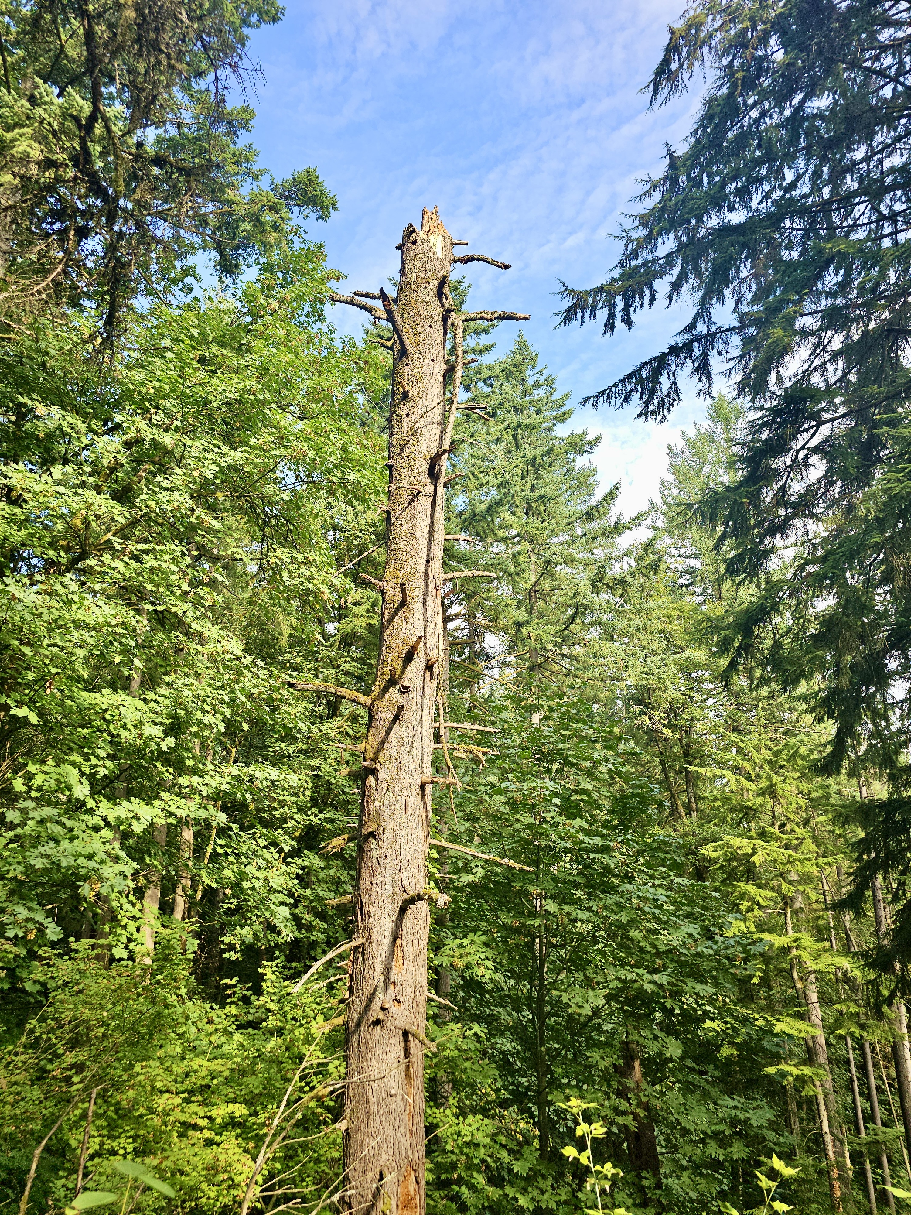 Alternative Text: A tall, broken tree trunk stands alone in the middle of a forest at Hoyt Arboretum, Washington Park, Portland. Bright daylight enhances the textures of bark and branches.