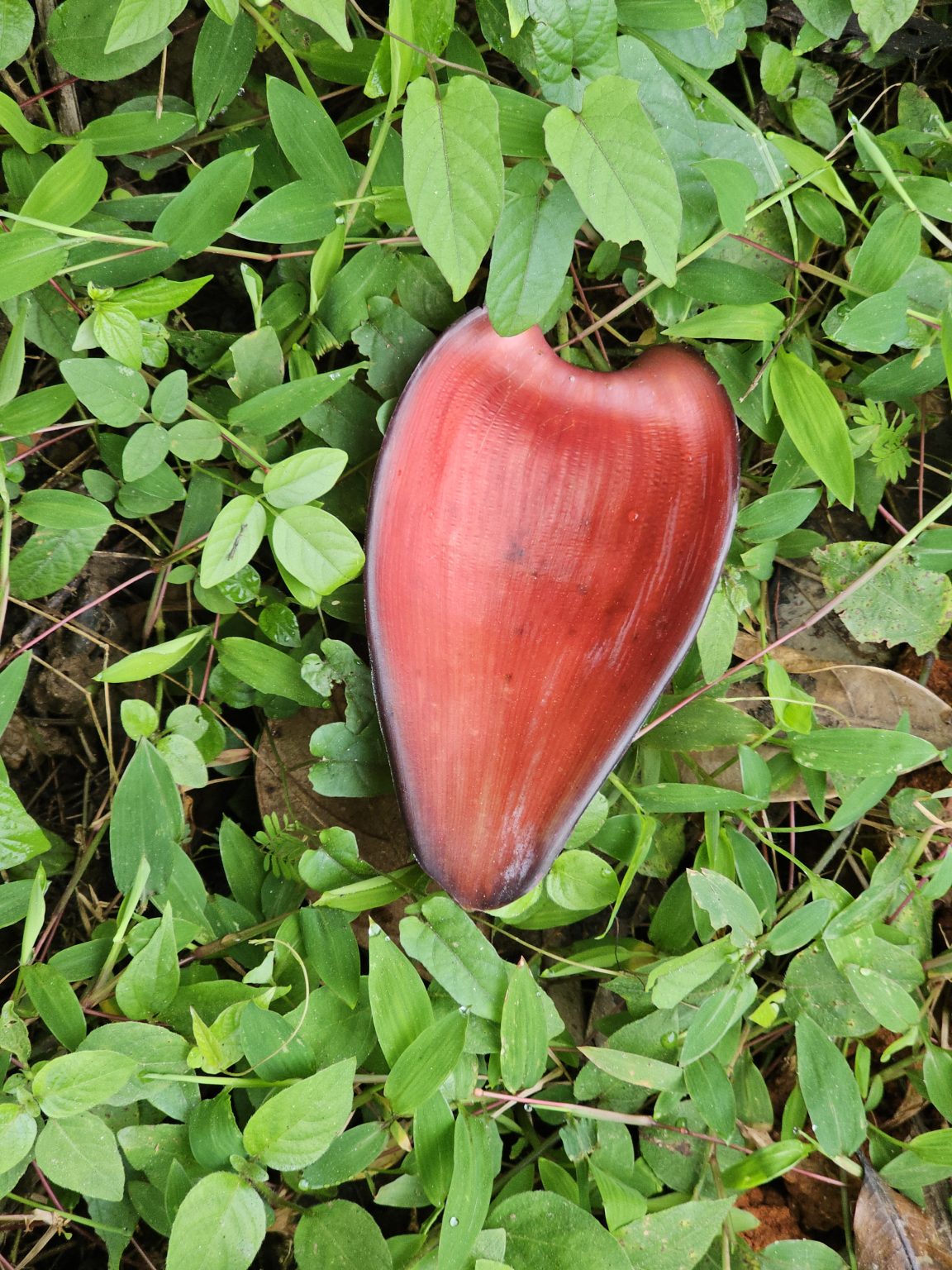 Alternative Text: A bright red banana blossom (banana flower) lies on a bed of fresh green groundcover leaves. Captured in Puttekadavu, Perumanna, Kozhikode.