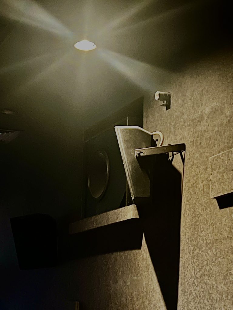 Alternative Text: A spotlight illuminates a dark, textured wall with a security camera mounted near the ceiling.