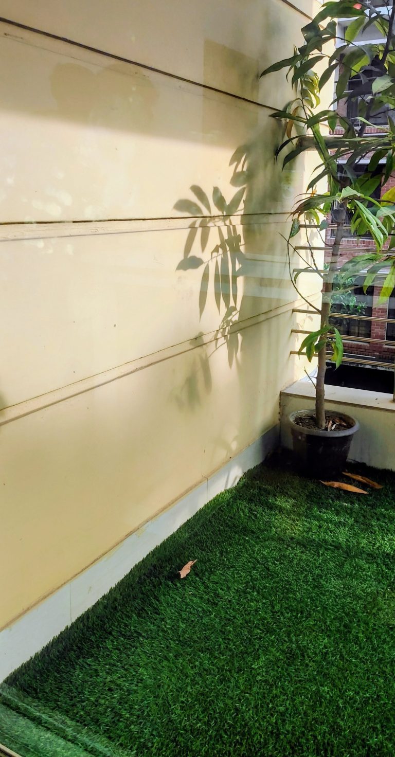 Alternative Text: Potted plant casting shadow on cream wall with artificial grass flooring and sunlight streaming through grid window
