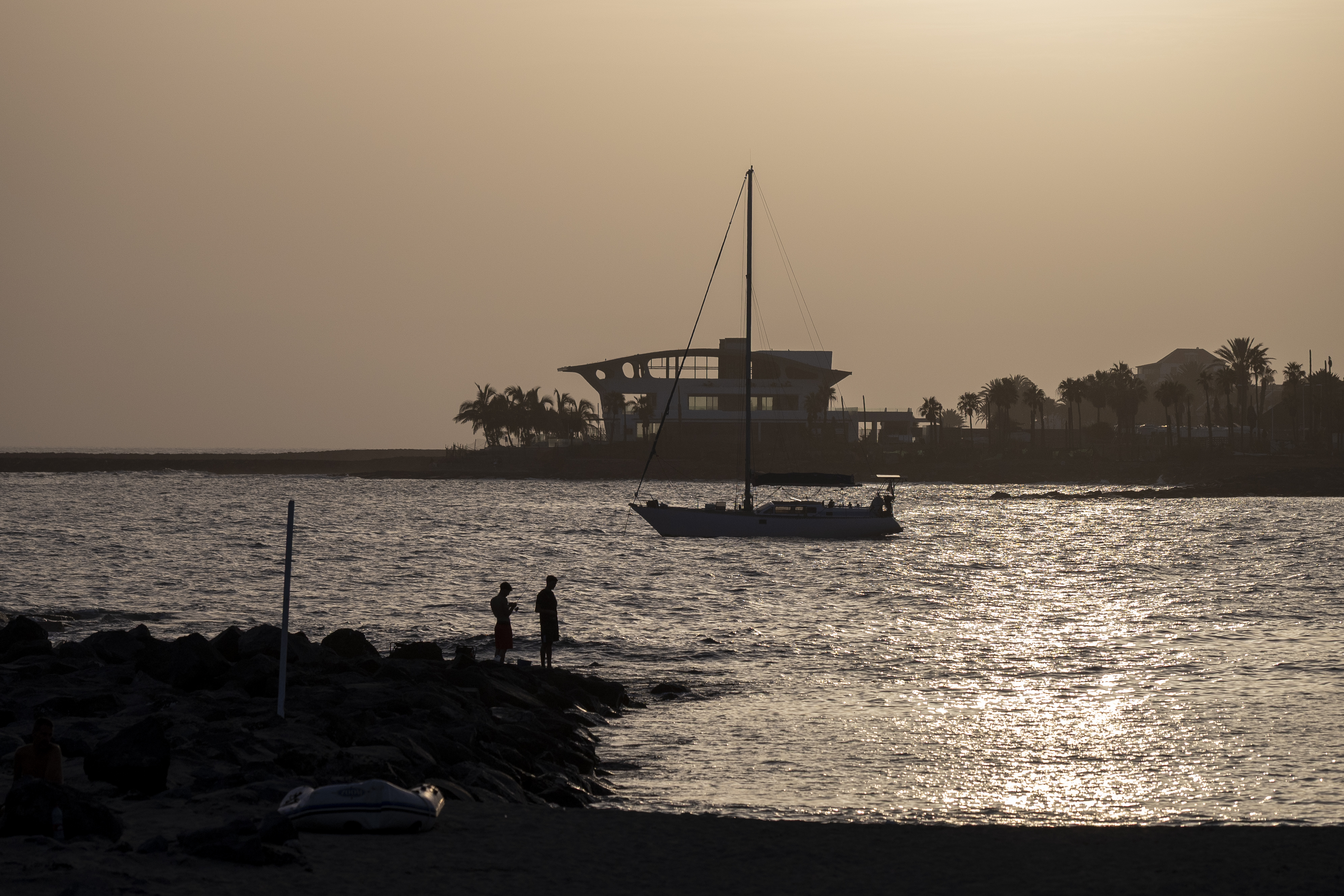 Alternative Text: A serene sunset view from Playa de Las Vistas in Playa de las Américas, Tenerife, with a sailboat on calm waters, two silhouetted figures standing on the rocky shore, and modern buildings and palm trees in the background.