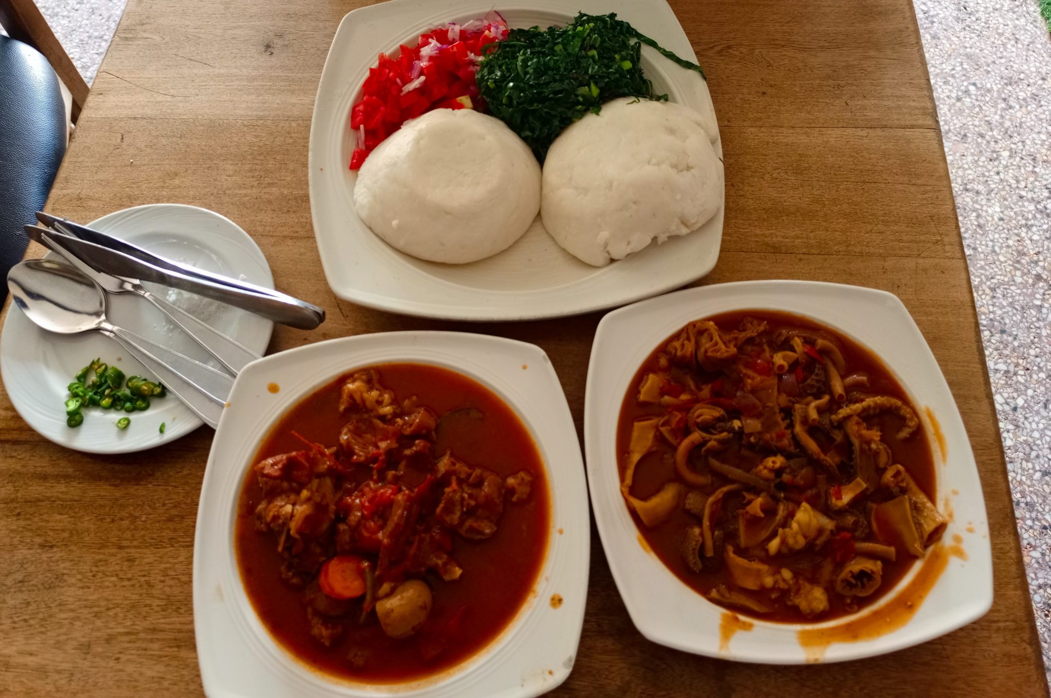 Alternative Text: Top-down view of posho, greens, kachumbari, and two bowls of stew served on a wooden table.