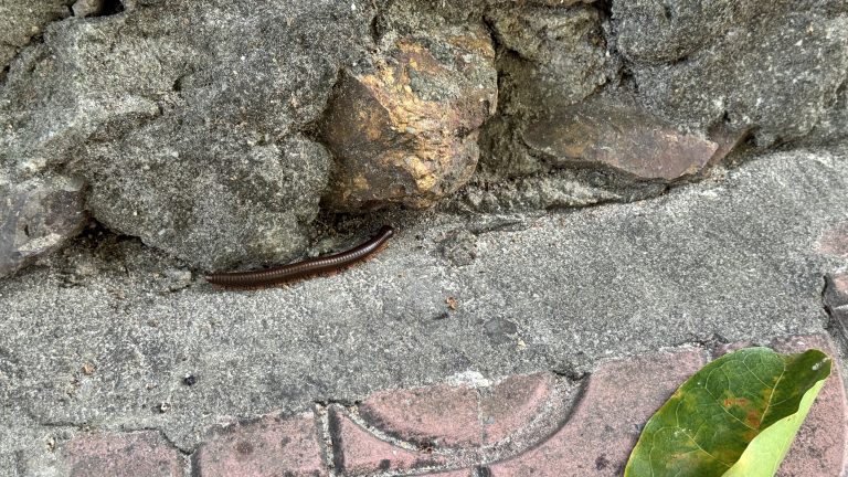 Alternative Text: A long brown millipede crawls along a grey concrete ledge at the base of a stone wall. One green leaf with brown spots is on the pink patterned ground nearby. The stone wall is made of rough rocks and looks very old.