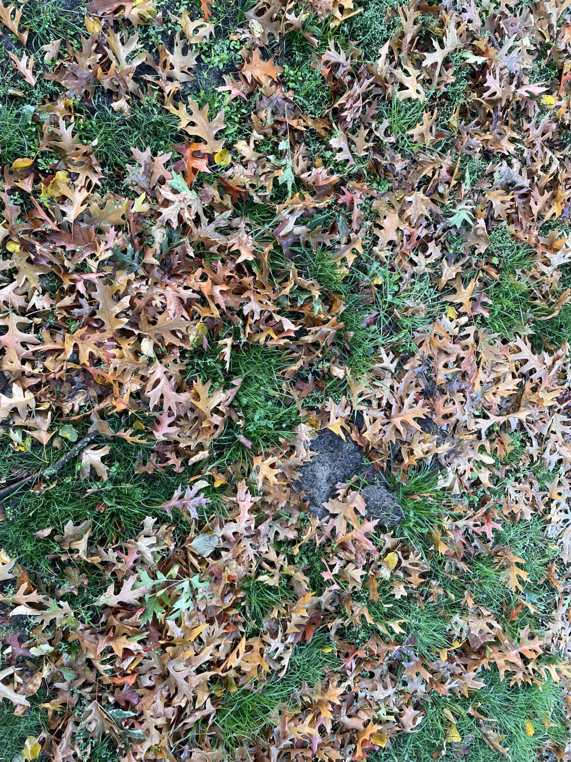 Alternative Text: Multi-colored autoumn leaves on a green lawn. Perspective and distance would be like looking at your feet.
