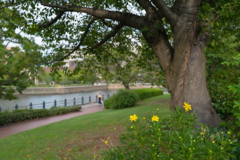Alternative Text: A vibrant green lawn features a cluster of yellow flowers in the foreground. In the background, a large, textured tree trunk and lush foliage frame a winding pathway along a calm river.