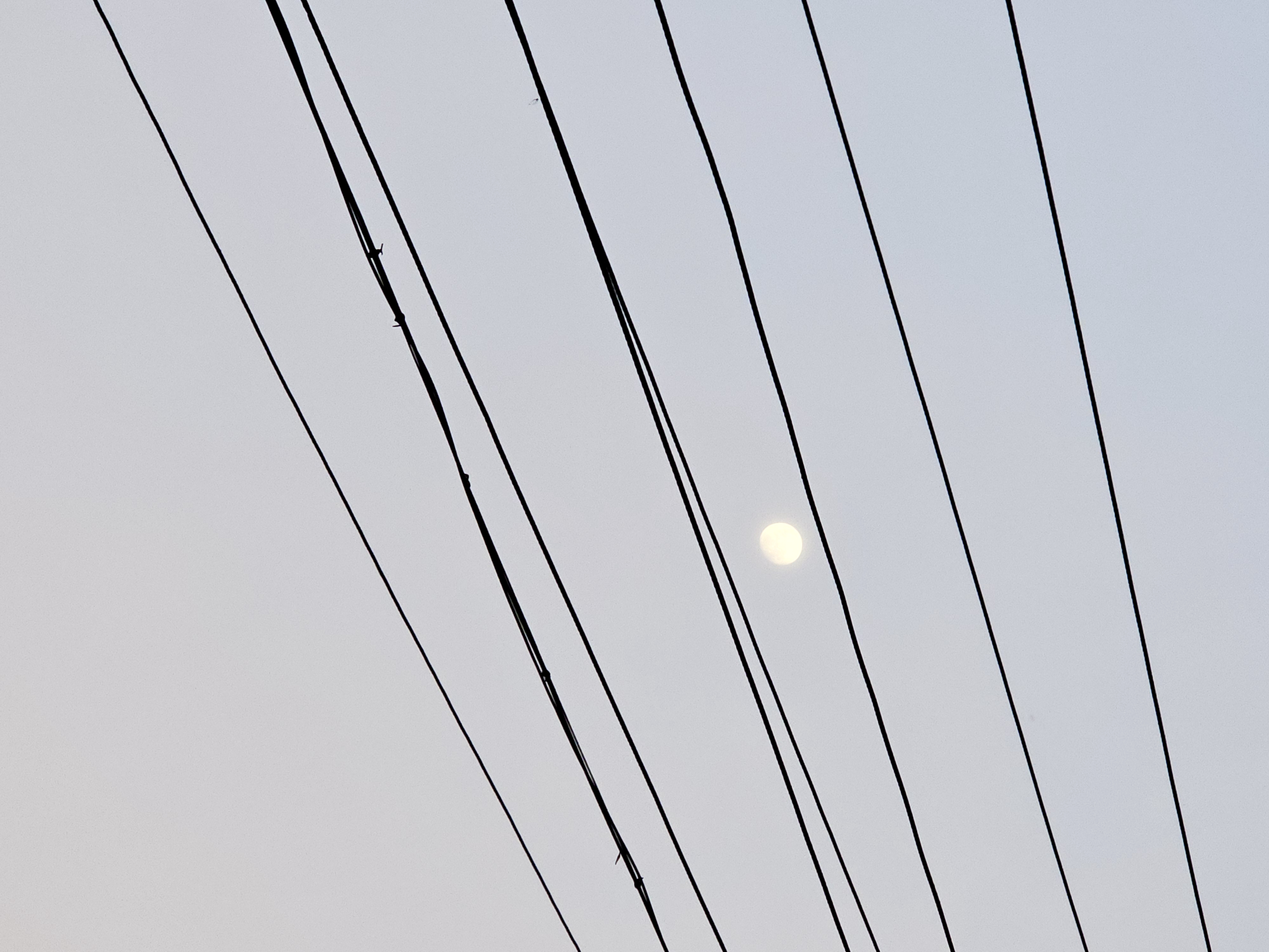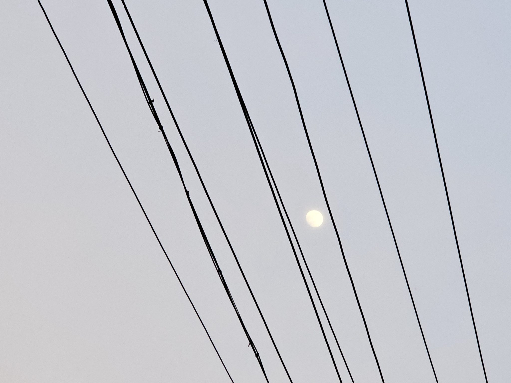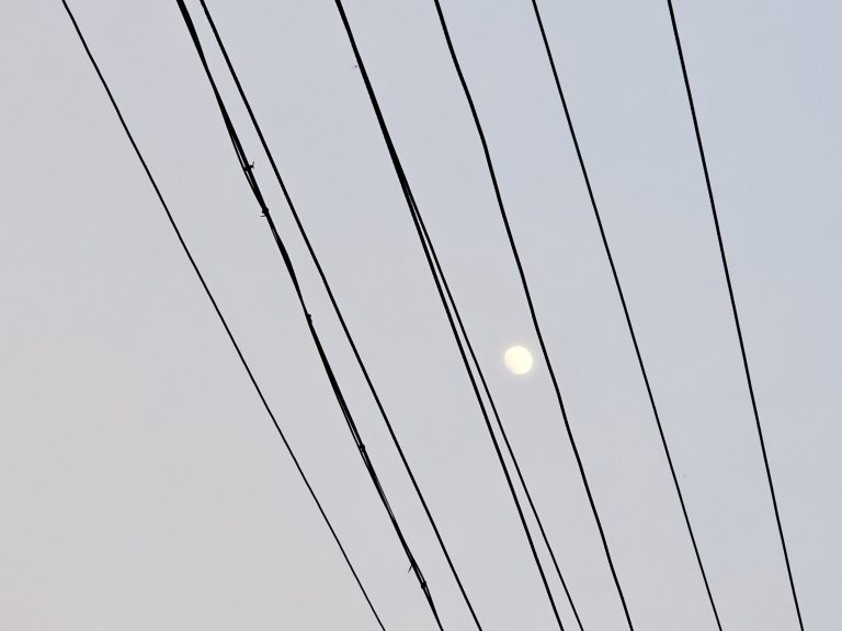Alternative Text: A bright full moon shines through a pattern of power lines stretched across the dusky sky in an evening scene from Cherupa, Kozhikode, Kerala.