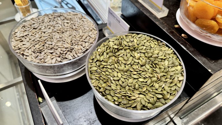 Alternative Text: Two glass bowls at a buffet are filled with shelled sunflower seeds and green pumpkin seeds for toppings or snacks.
