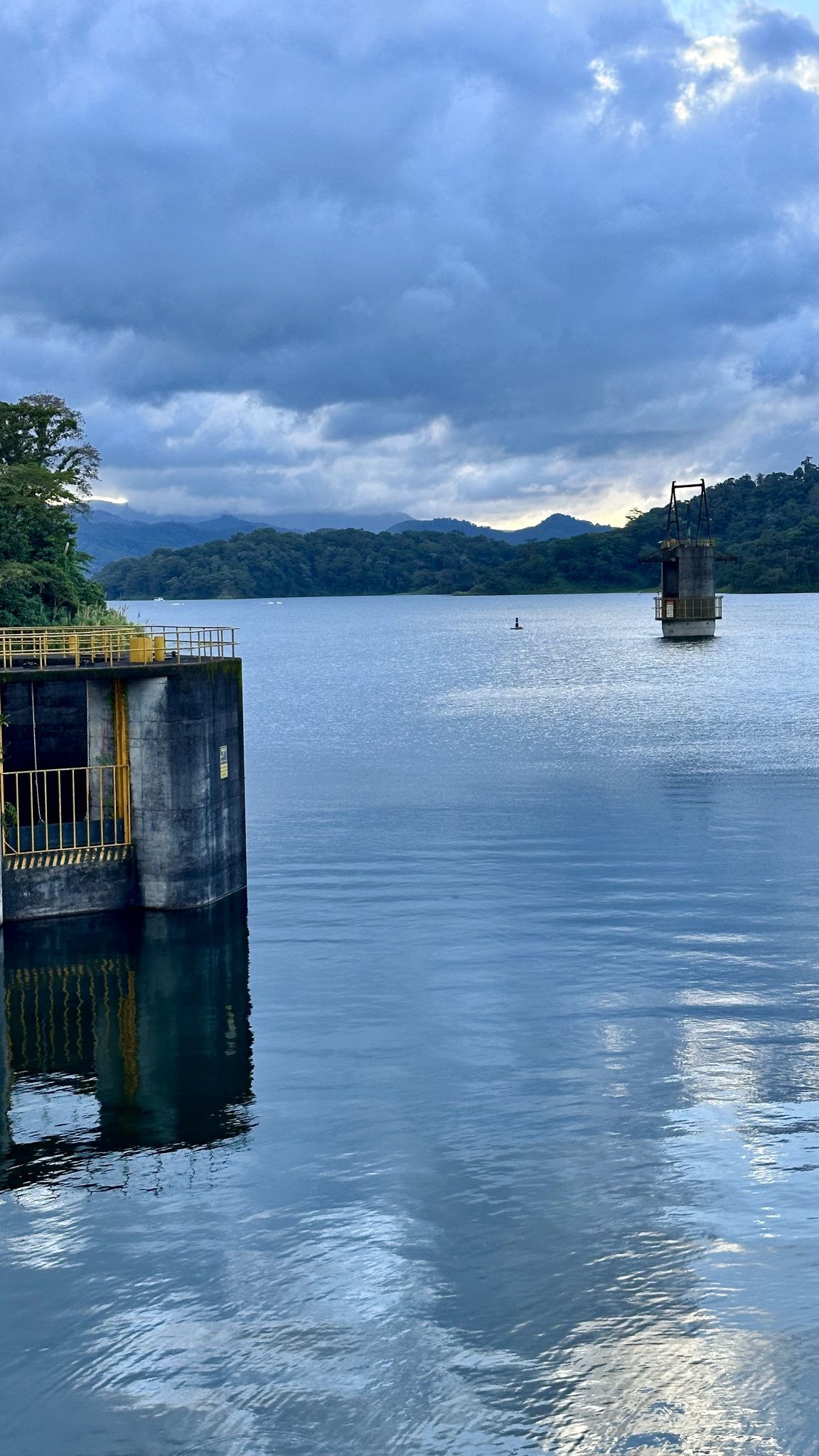 Alternative Text: Close-up of a hydroelectric dam with soft blue tones, capturing water movement and structural details.