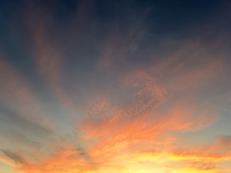 Alternative Text: A vibrant sunset sky filled with swirling clouds in shades of orange, red, and deep blue, creating a dramatic and colorful backdrop.