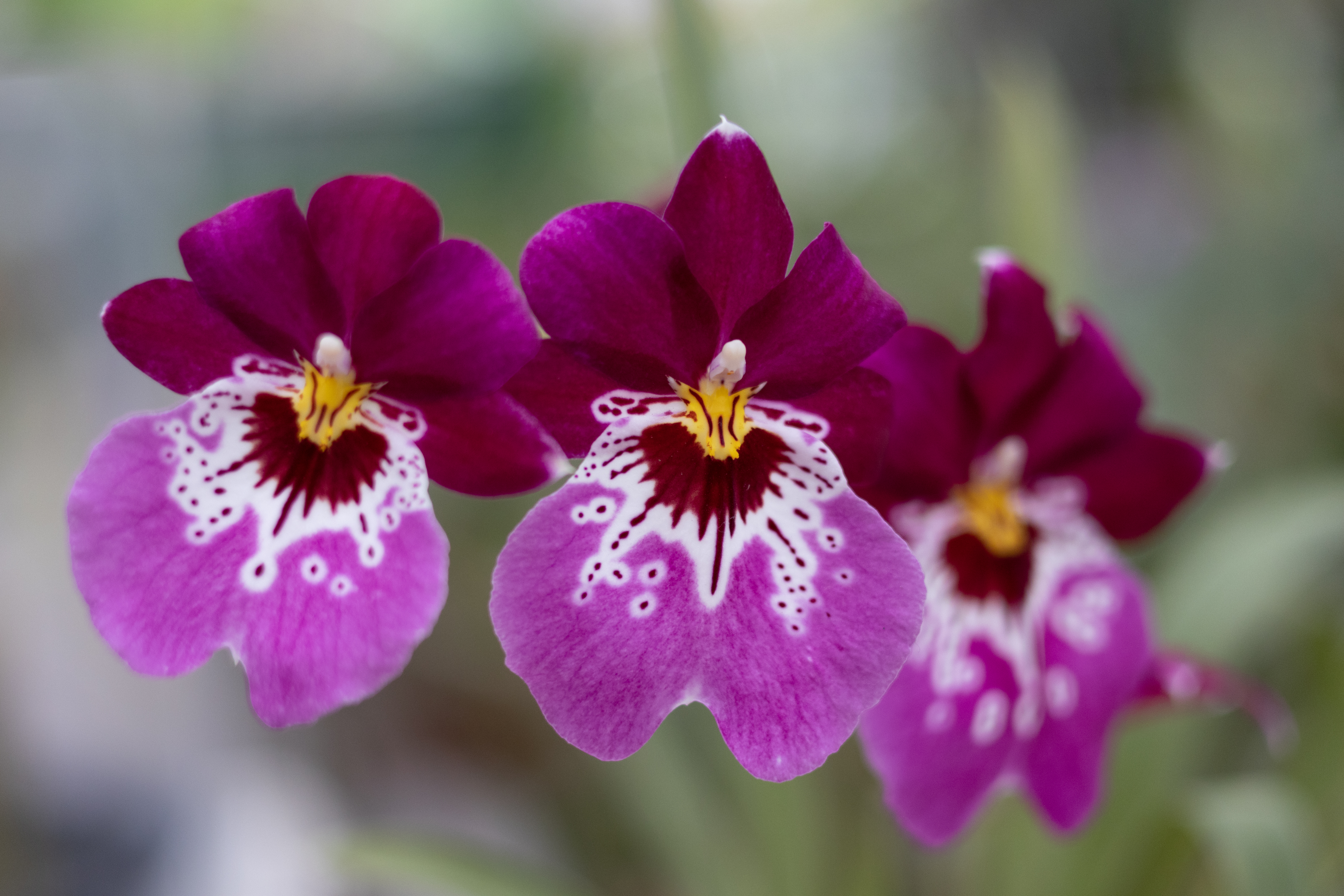 Alternative Text: Close-up of vibrant pink and purple orchid flowers with white and yellow centers, set against a softly blurred green background.