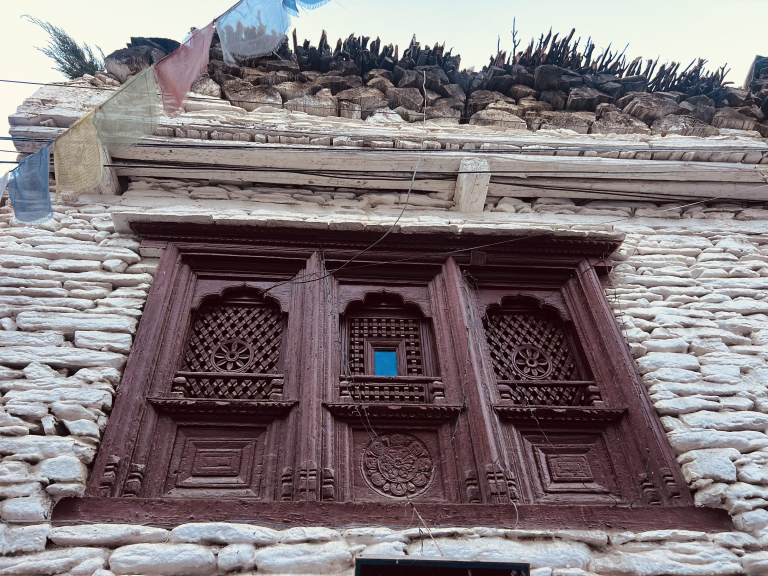 Alternative Text: A close-up view of a traditional building made of white stones, featuring intricately carved wooden windows painted in a deep reddish-brown color.