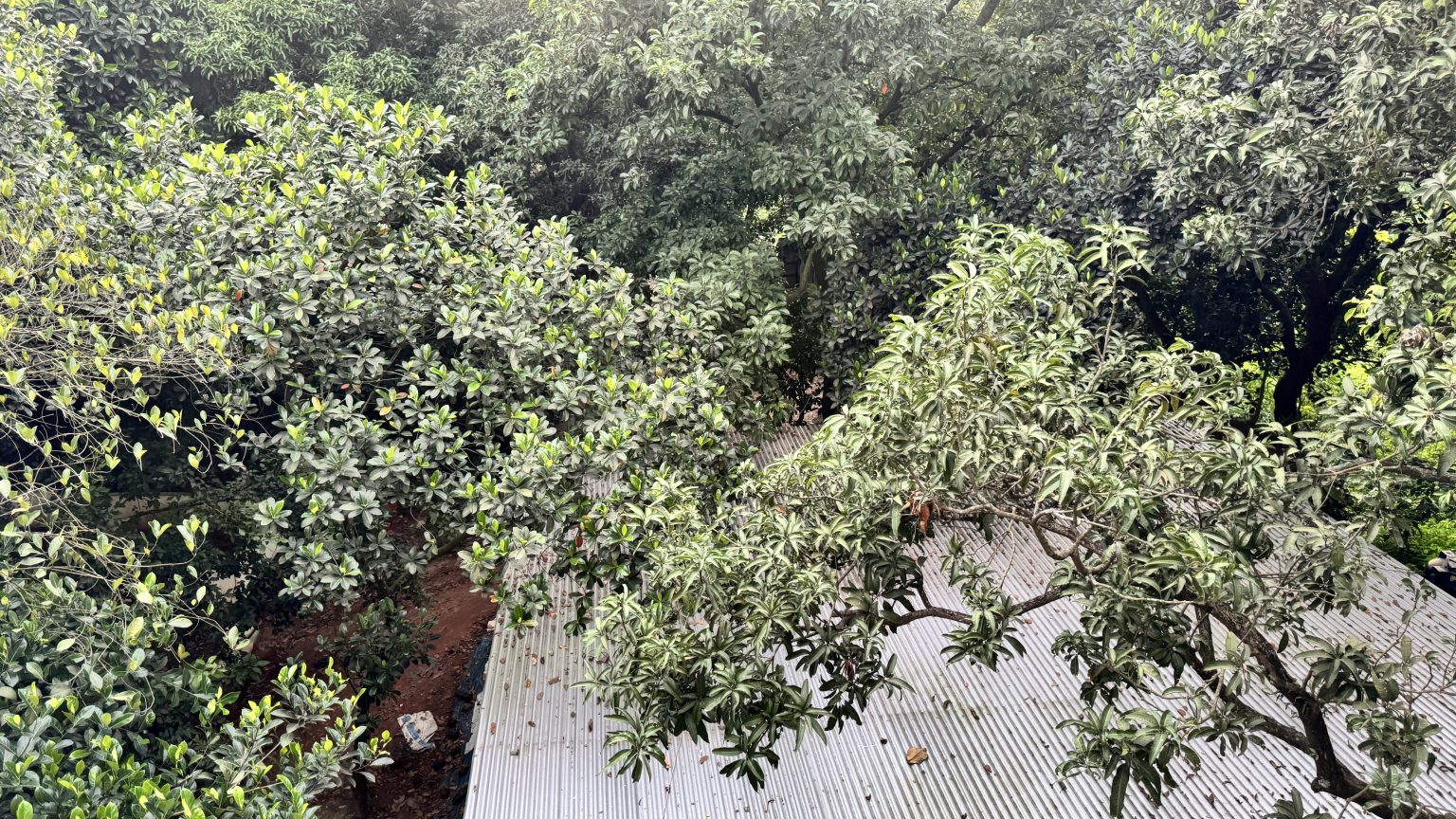 Alternative Text: A high-angle view looks down upon the dense, green canopies of several fruit trees growing over a corrugated metal roof.