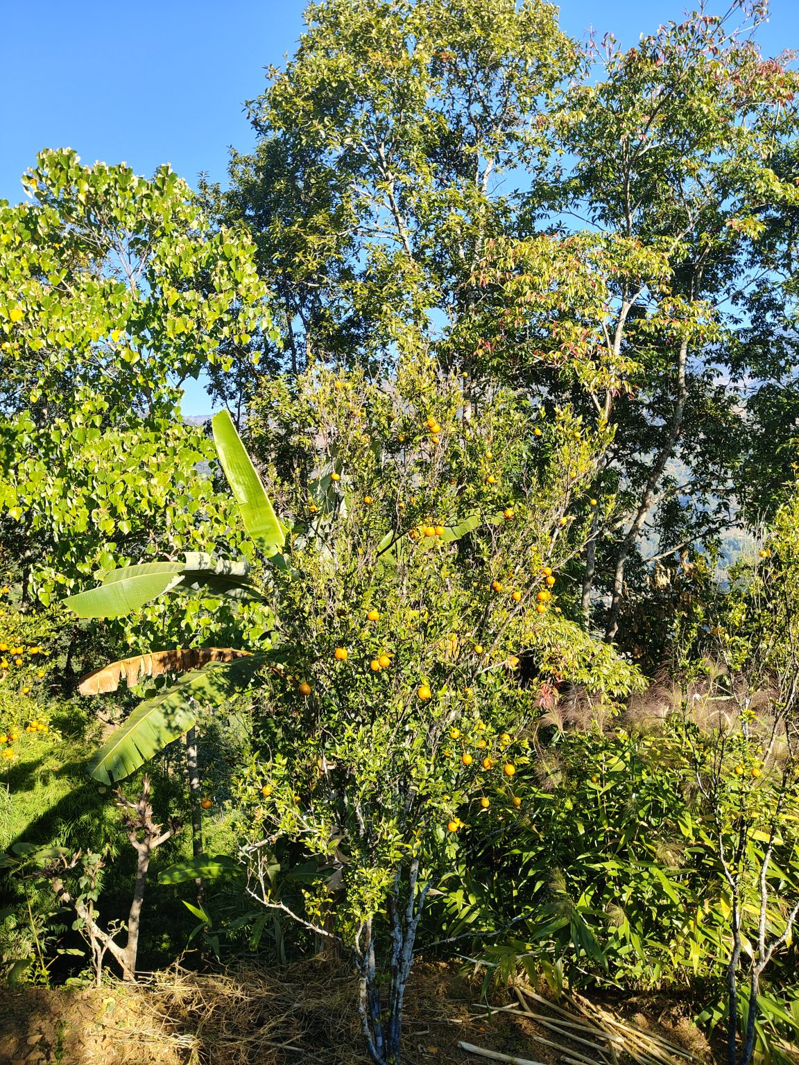 Alternative Text: A sunny landscape featuring various trees and plants, including a small citrus tree laden with orange fruit.