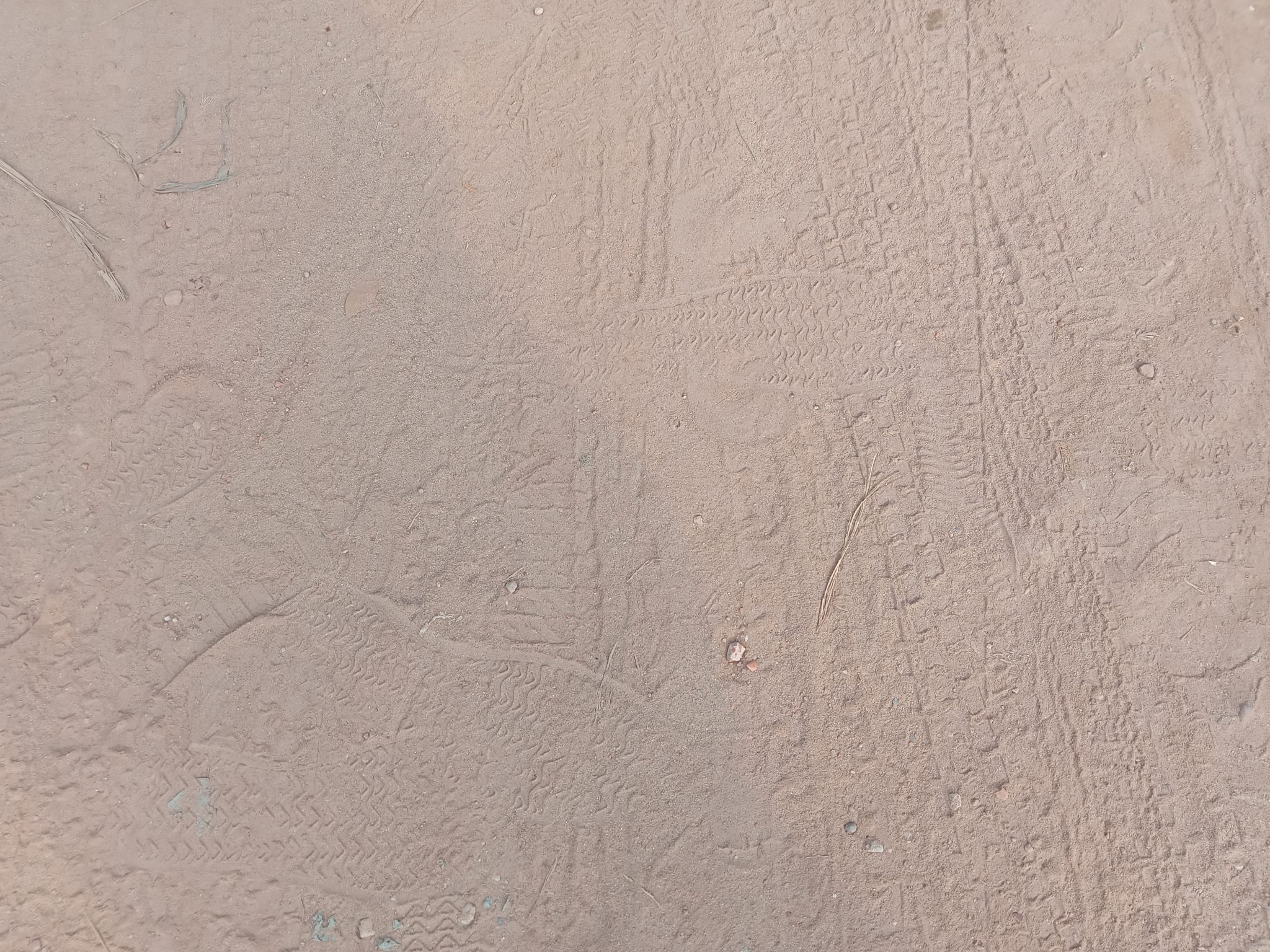 Alternative Text: A close-up view of a sandy surface displaying various patterns and textures, including tire treads and possible footprints.