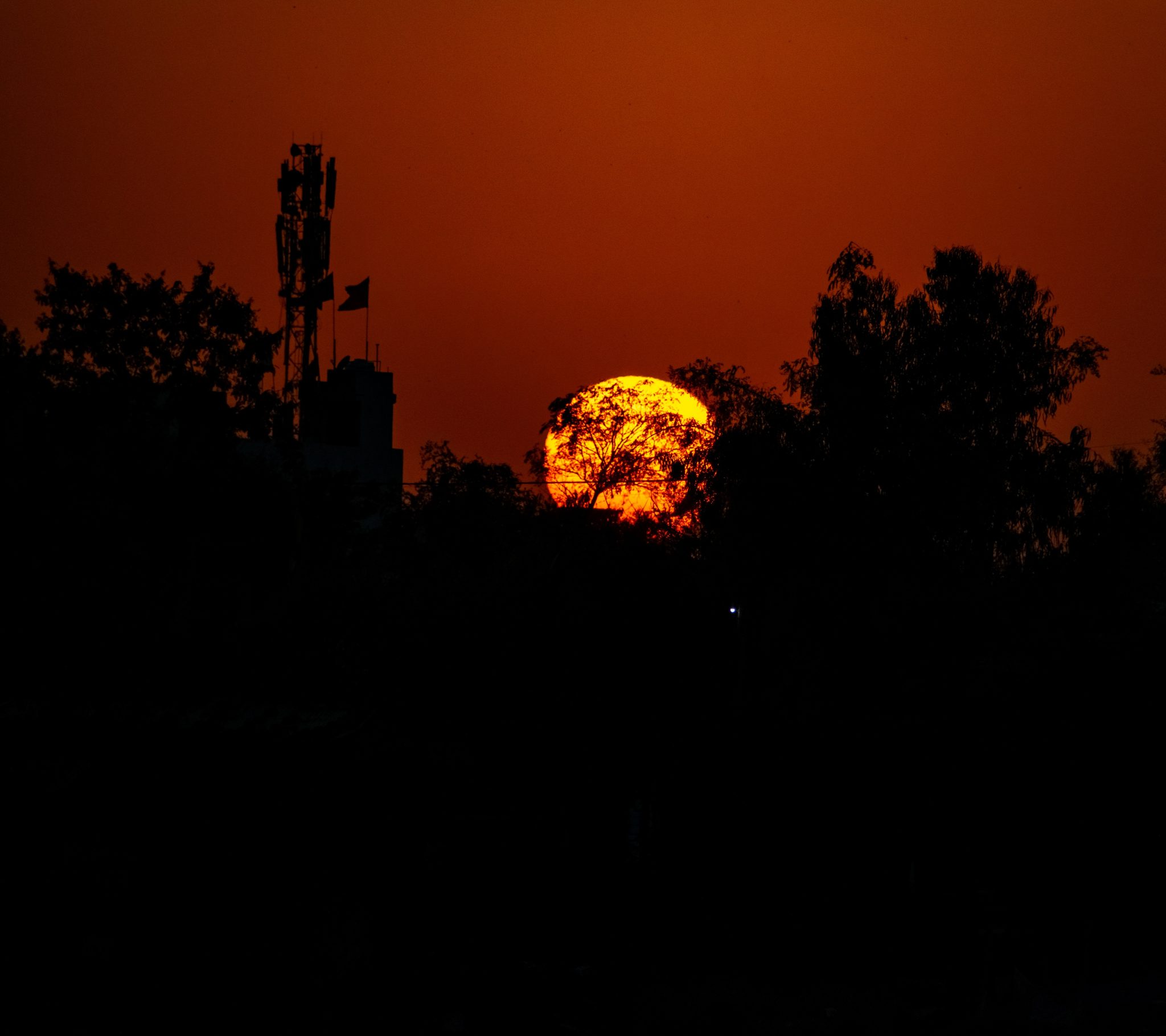 Alternative Text: A fiery orange sun sinks behind silhouetted trees and a lone communication tower, casting a dramatic glow across the darkened skyline at dusk.