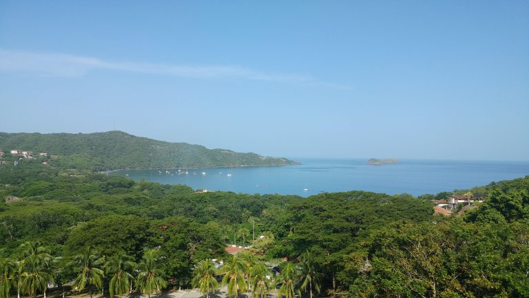 Alternative Text: A panoramic view of a coastal landscape featuring lush green hills and trees in the foreground, leading down to a serene blue ocean.