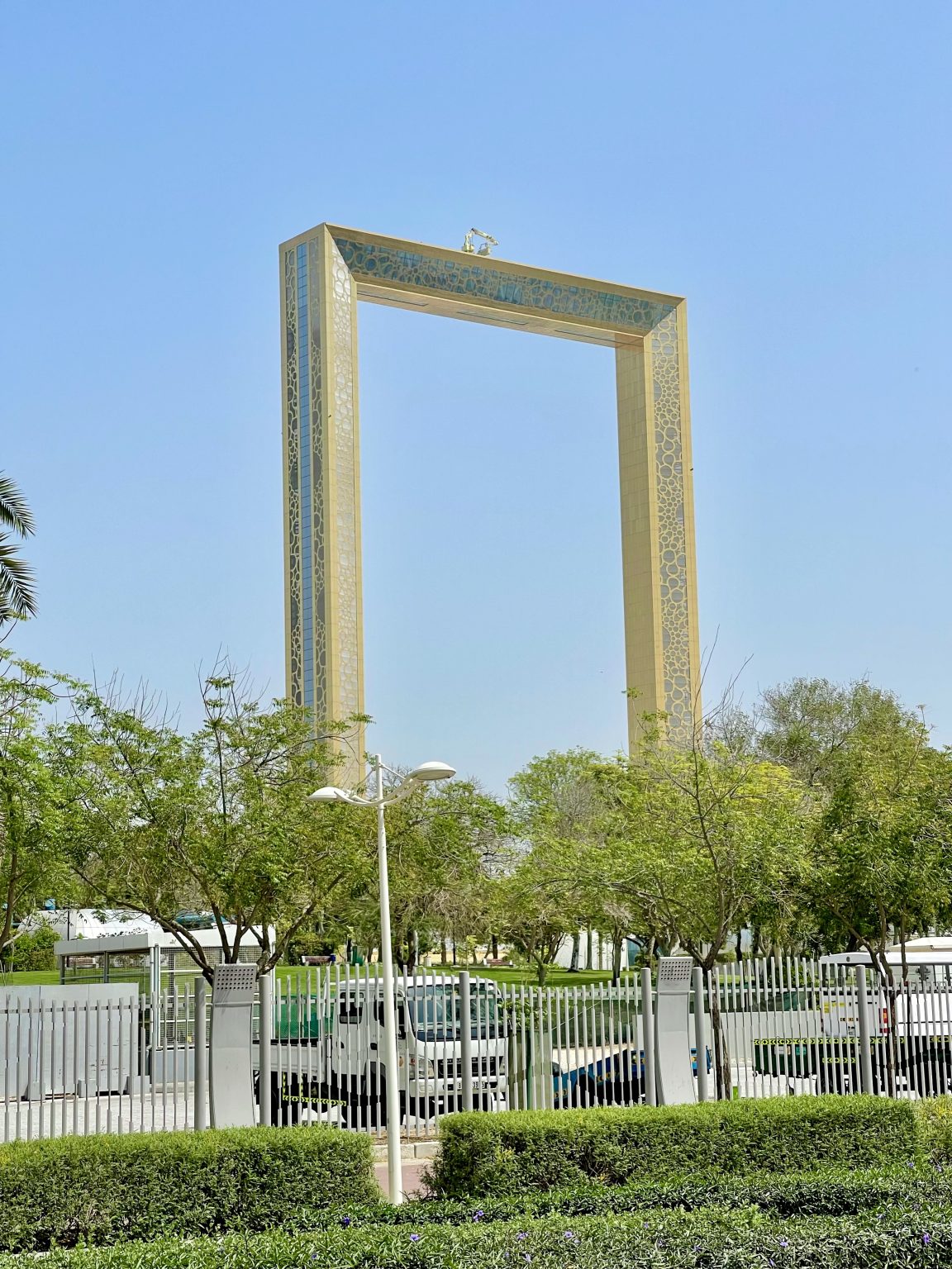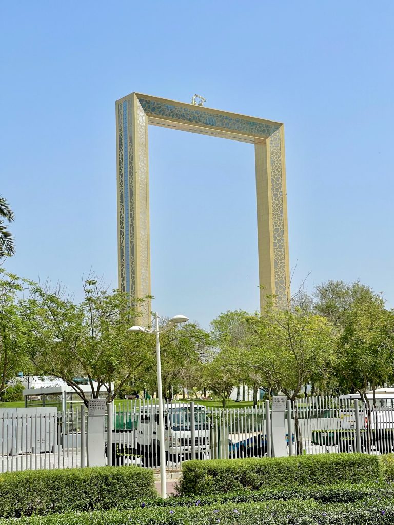 Alternative Text: The Dubai Frame structure rises above green trees and a fence.