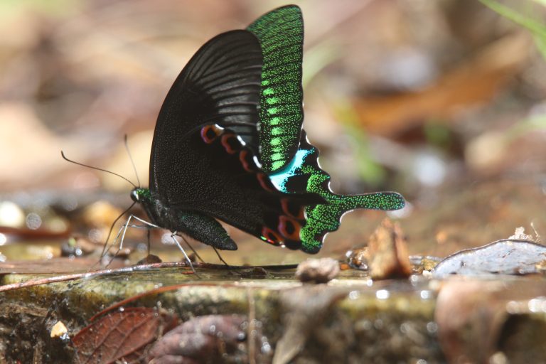 Alternative Text: A close-up shot of a Papilio paris sitting on a wet stone.