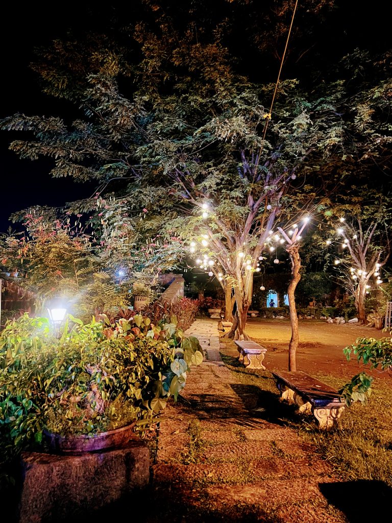 Alternative Text: A nighttime garden scene with a path leading past stone benches and large trees, illuminated by strands of warm-toned hanging fairy lights.