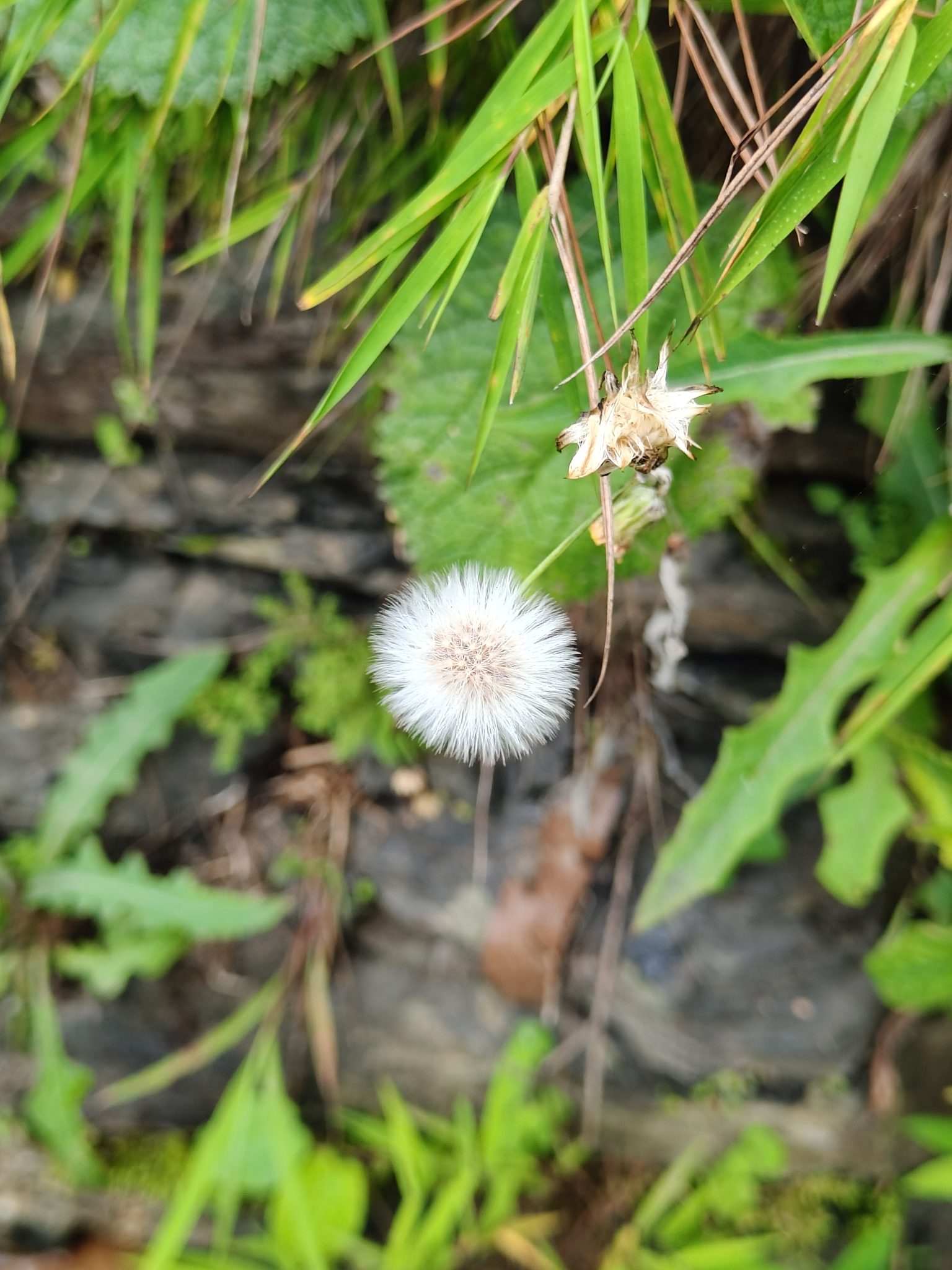 Alternative Text: A close-up view of a dandelion puff, white and fluffy, suspended among green grass and neighboring plants.