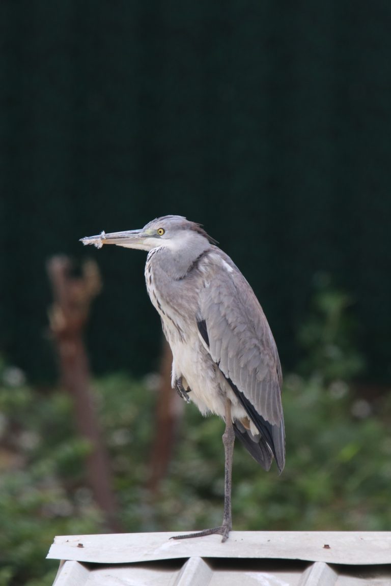 Alternative Text: A Grey Heron standing on one leg on the roof of a fishing warehouse located in the middle of a river.