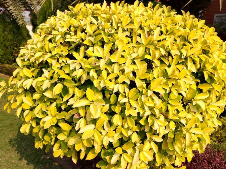 Alternative Text: A lush, rounded shrub covered in vibrant yellow-green leaves, with some leaves showing light green shades
