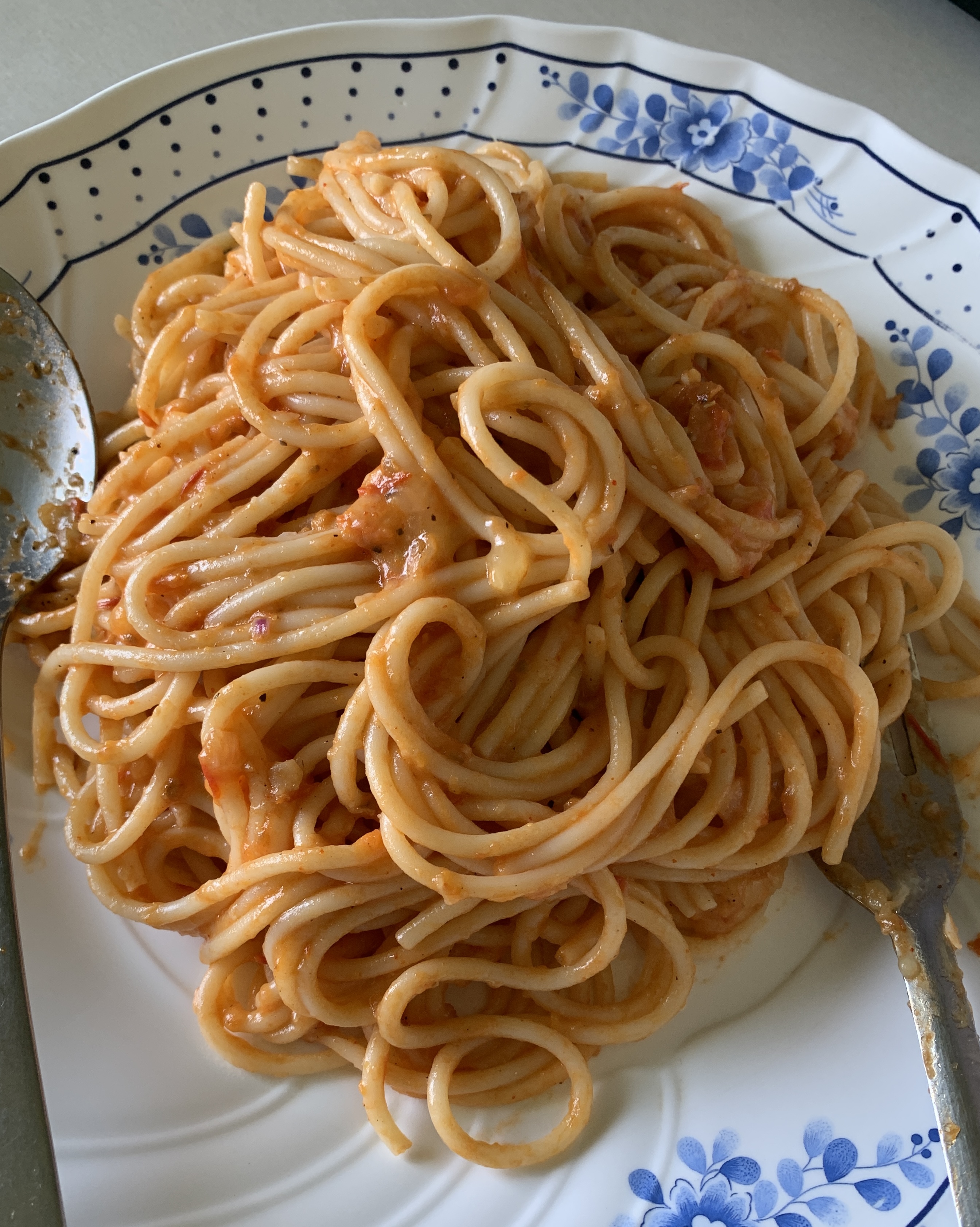 Alternative Text: A plate of spaghetti is piled high, coated in a rich, reddish sauce. The dish is served on a white plate with a blue floral design.