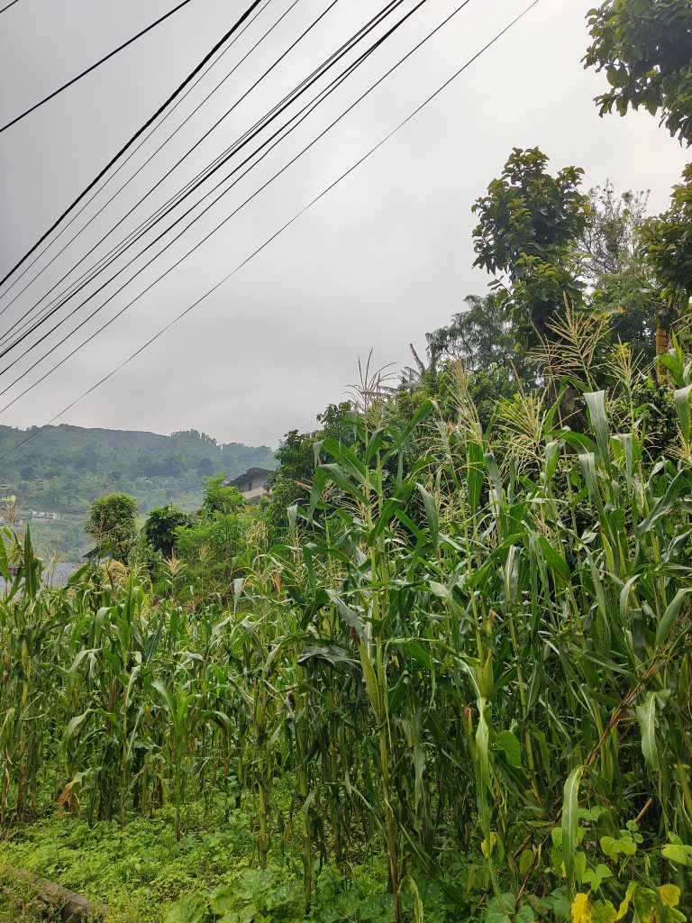 Alternative Text: A lush field of tall corn plants stretches across the foreground, with green foliage clustering around the stalks